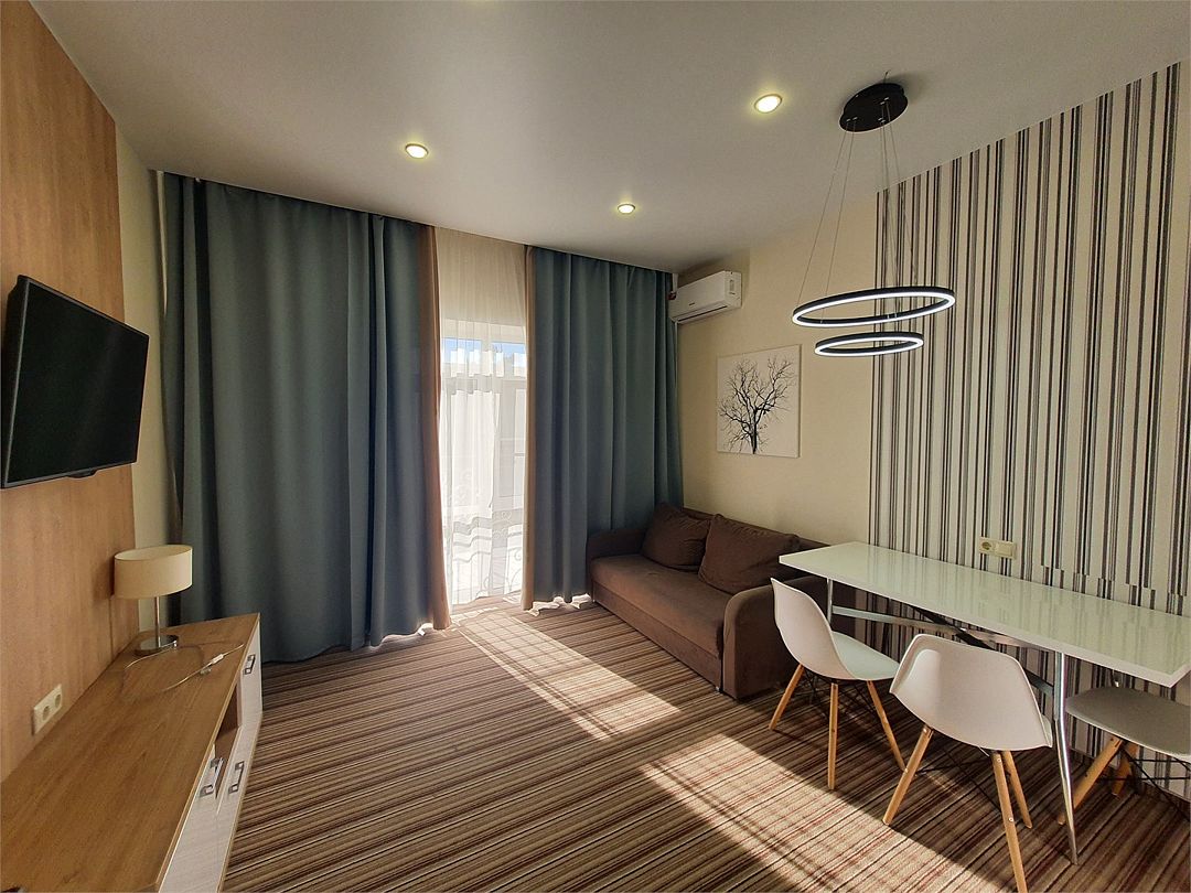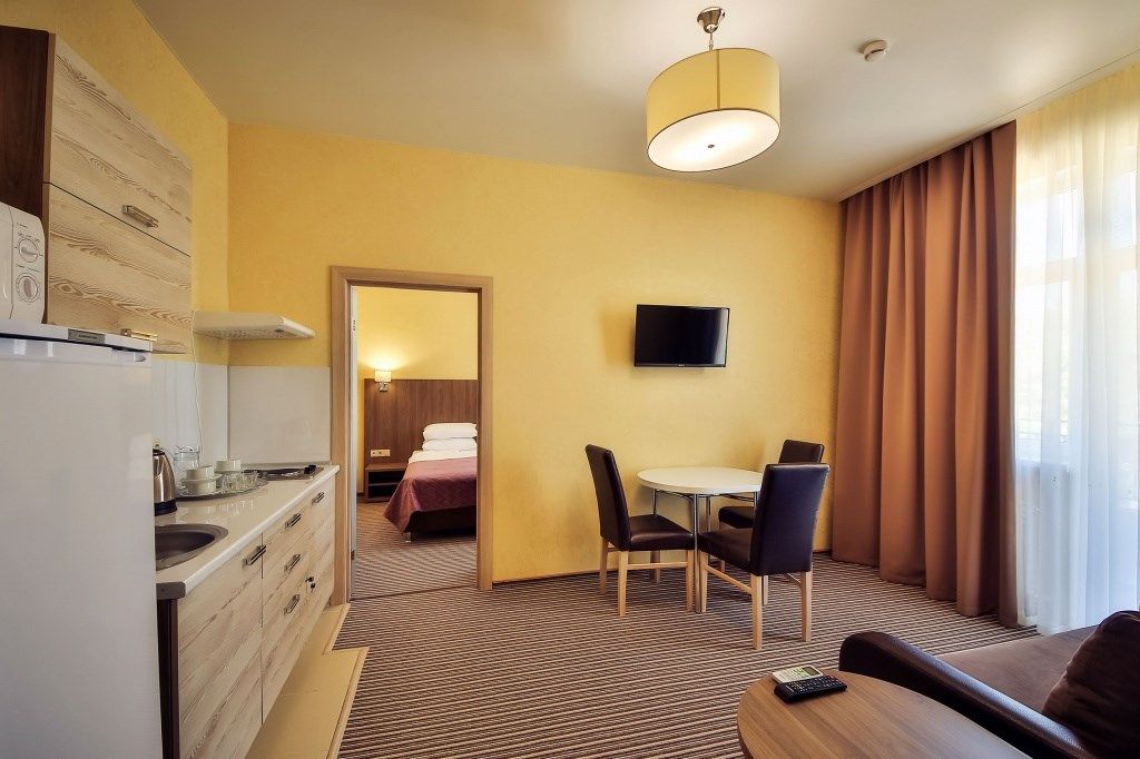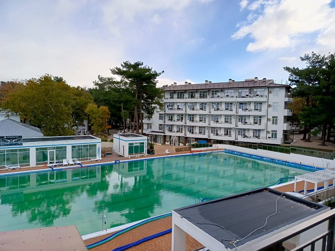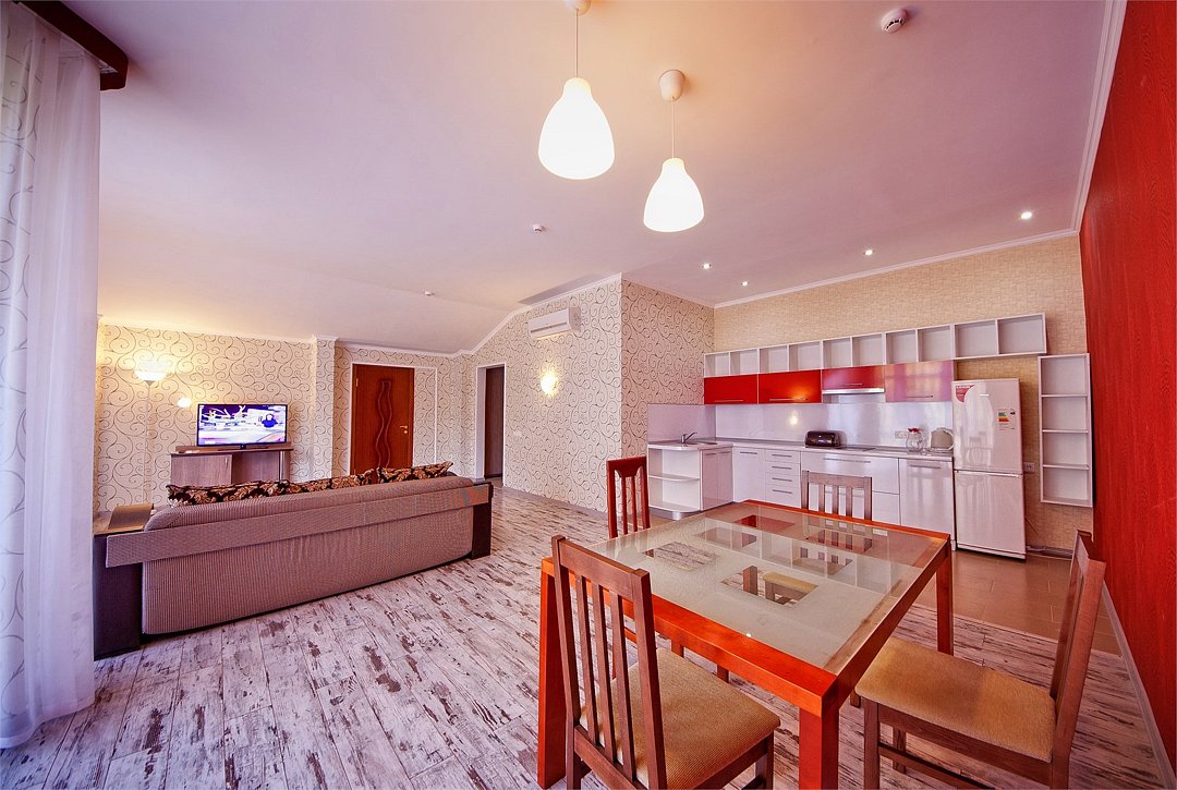 Дизайн отделки номеров может отличаться от указанного на фото. Спальня состоит из двух односпальных кроватей (соединяются в двуспальную кровать топпером), телевизора и зоны “Рабочей место” с рабочей поверхностью и удобным стулом. Гостиная зона с диваном-кроватью и телевизором, обеденной и кухонной зоной, оснащенной большим холодильником, электрической плитой с вытяжкой, раковиной, электрическим чайником и набором посуды. В ванной комнате установлен душ. В коридоре просторный встроенный шкаф. Во всех номерах этой категории есть WIFI и фен, сплит-система. Мы предоставляем утюг и гладильную доску на этаже. Полотенца меняют каждые 3-4 дня, а постельное белье - еженедельно. Уборка осуществляется ежедневно (с 08:00 до 15:00). Номера расположены в корпусах 1, 4 и 6 на трех этажах. Все номера с балконами. Напротив зданий спортивные бассейны.Услуги и удобства