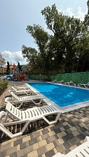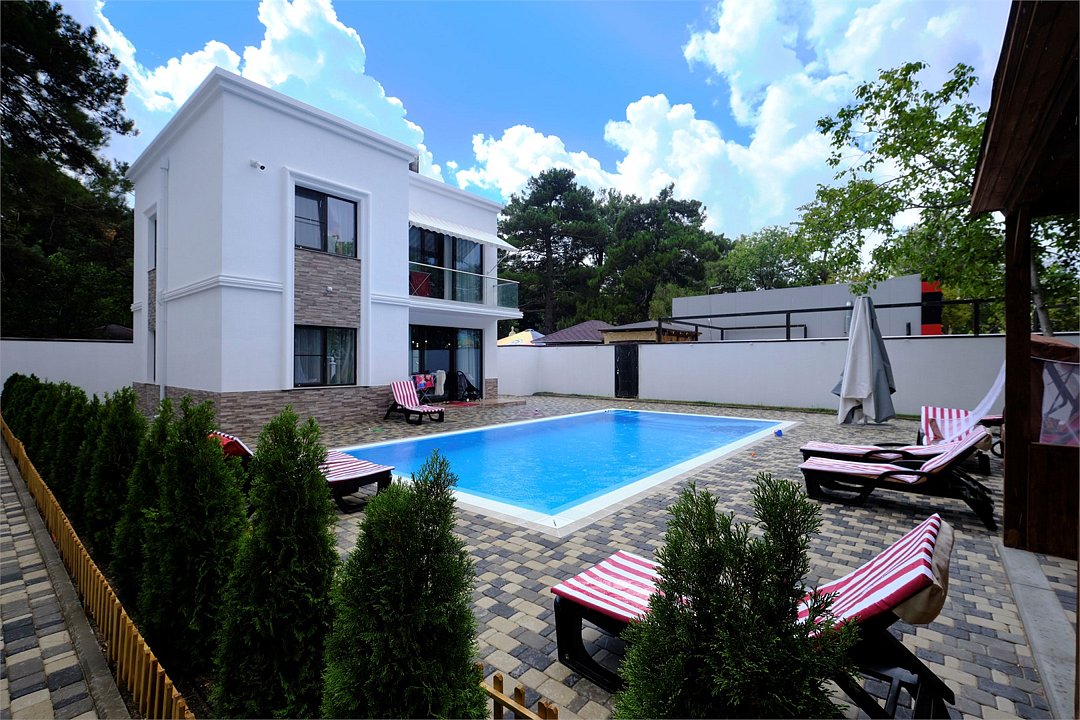 Дизайн отделки номеров может отличаться от указанного на фото. Коттедж с бассейном и зоной барбекю, вмещающий до 6 человек. В номере две комнаты и гостиная с кухонной зоной. Спальни состоят из двух односпальных кроватей или одной двуспальной, телевизора и зоны «Рабочее место» с рабочей поверхностью и удобным стулом. Гостиная имеет прямой выход на террасу или балкон и состоит из дивана-кровати, обеденной и кухонной зоны. Кухня оборудована электрической плитой, вытяжкой, раковиной, холодильником и посудой. В ванной комнате установлен душ. В коридоре просторный встроенный шкаф. Во всех номерах этой категории есть фен и сплит-система, утюг и гладильная доска. Полотенца меняют каждые 3-4 дня, а постельное белье - еженедельно. Уборка осуществляется ежедневно (с 08:00 до 15:00). Номера располагаются на первом и втором этаже вилл с отдельным входом. Бассейн и территория доступны для обоих этажей. Бассейн индивидуальный для каждой виллы. Примечание: с 01.10.2025 по 30.04.2026 бассейны возле вилл находятся на техническом обслуживании. По карте гостя доступны открытый 50 м бассейн, а также крытый 25 м бассейн.Услуги и удобства