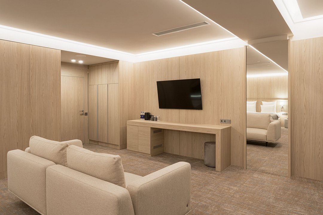 номер оборудован инфракрасной сауной, массажным столом, расширенным набором бытовой и медицинской техники.