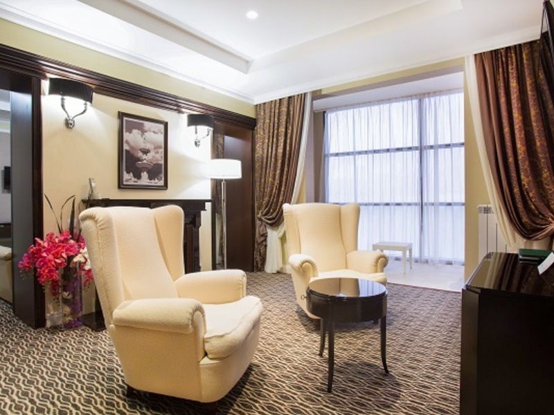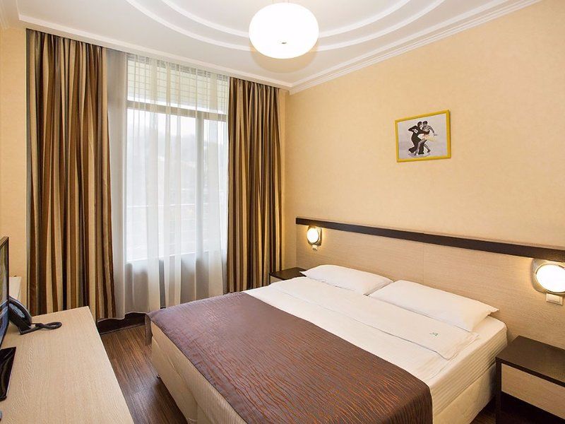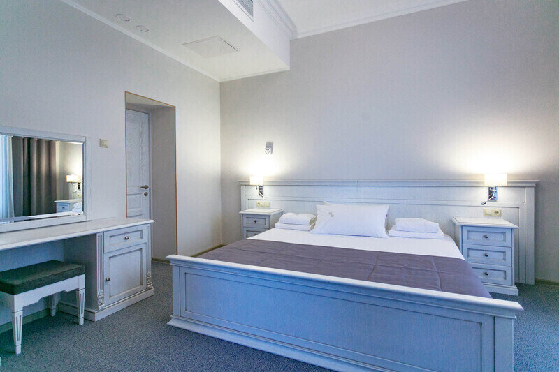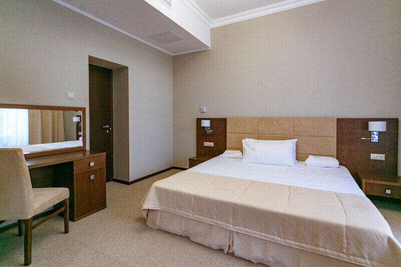 Номер состоит из спальни с двумя раздельными кроватями, гостиной с балконом и собственной ванной комнаты. В гостиной есть раскладной диван, где могут разместиться ещё двое гостей. С балкона открывается вид на горную реку. Гости корпуса могут пользоваться всей инфраструктурой основной территории, до которой можно доехать на автобусе санатория, регулярно курсирующего по расписанию.