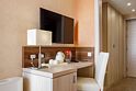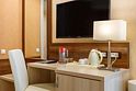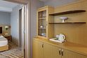 телевизор, кабельное телевидение, телефон, светильник, фен, электронные замки, ванная комната, душевая кабина, банные принадлежности, халаты, банные полотенца, тапочки, балкон, односпальная кровать, тумбы, стулья, шкаф для одежды, вешалки, письменный стол, багажная тумба, две комнаты, чайный набор, сейф, чайник, унитаз, раковина, мини-холодильник, фанкойлВ гостиничном номере