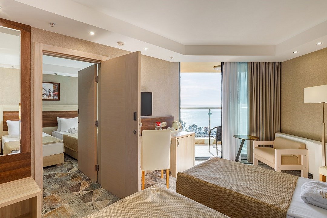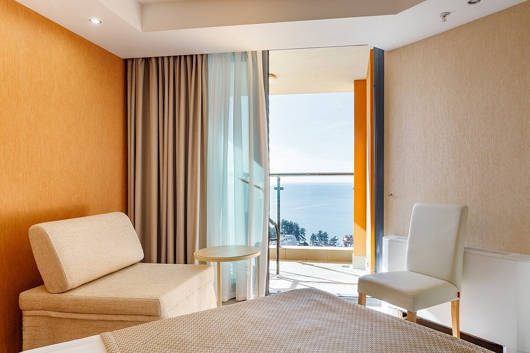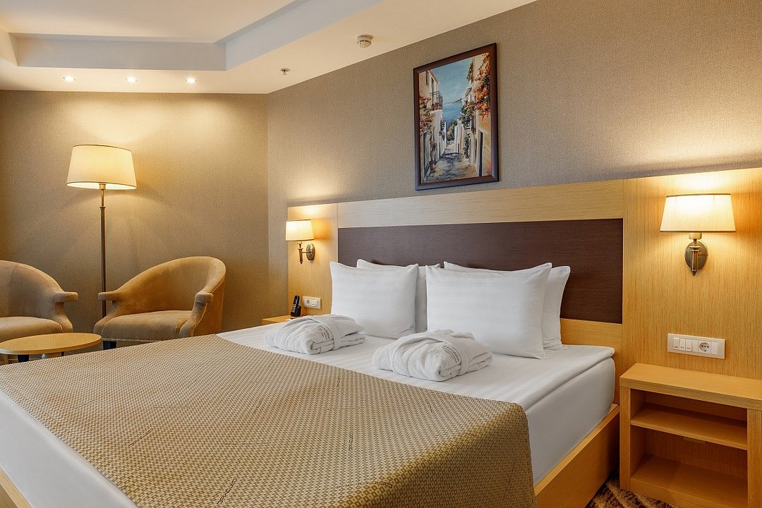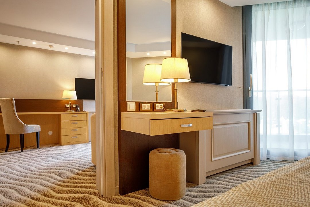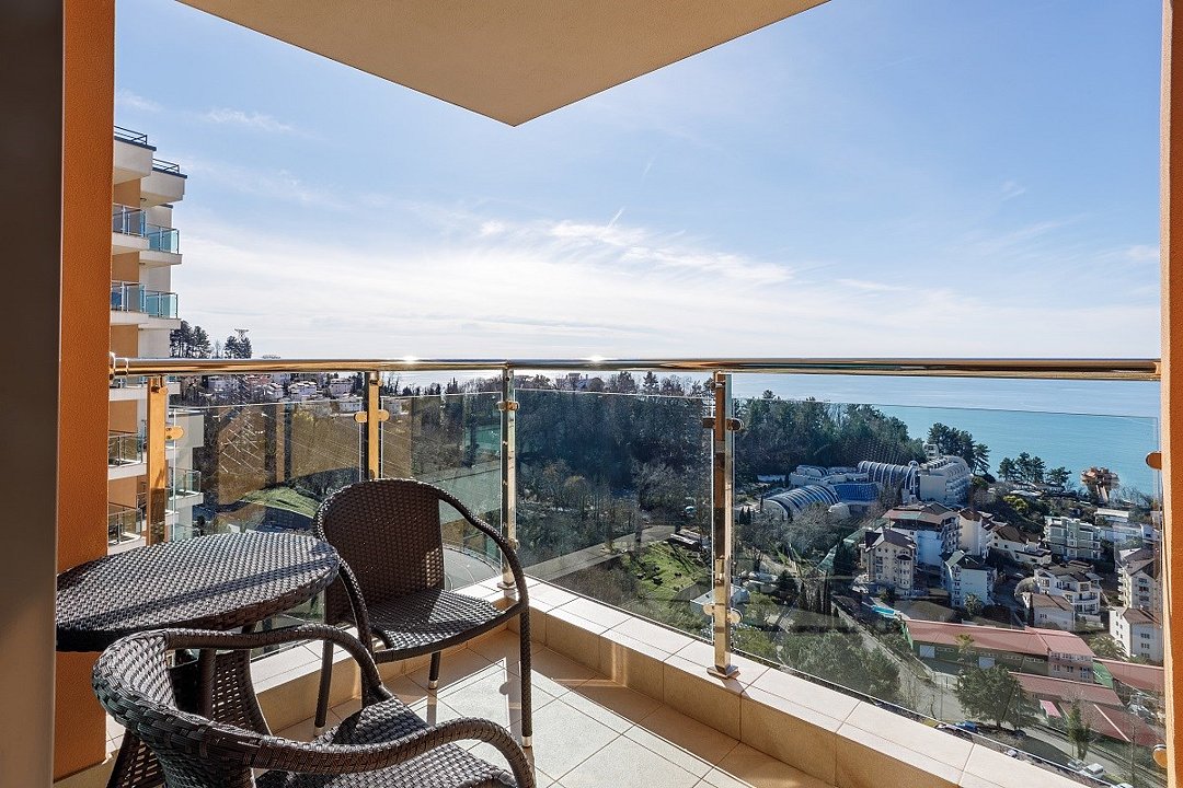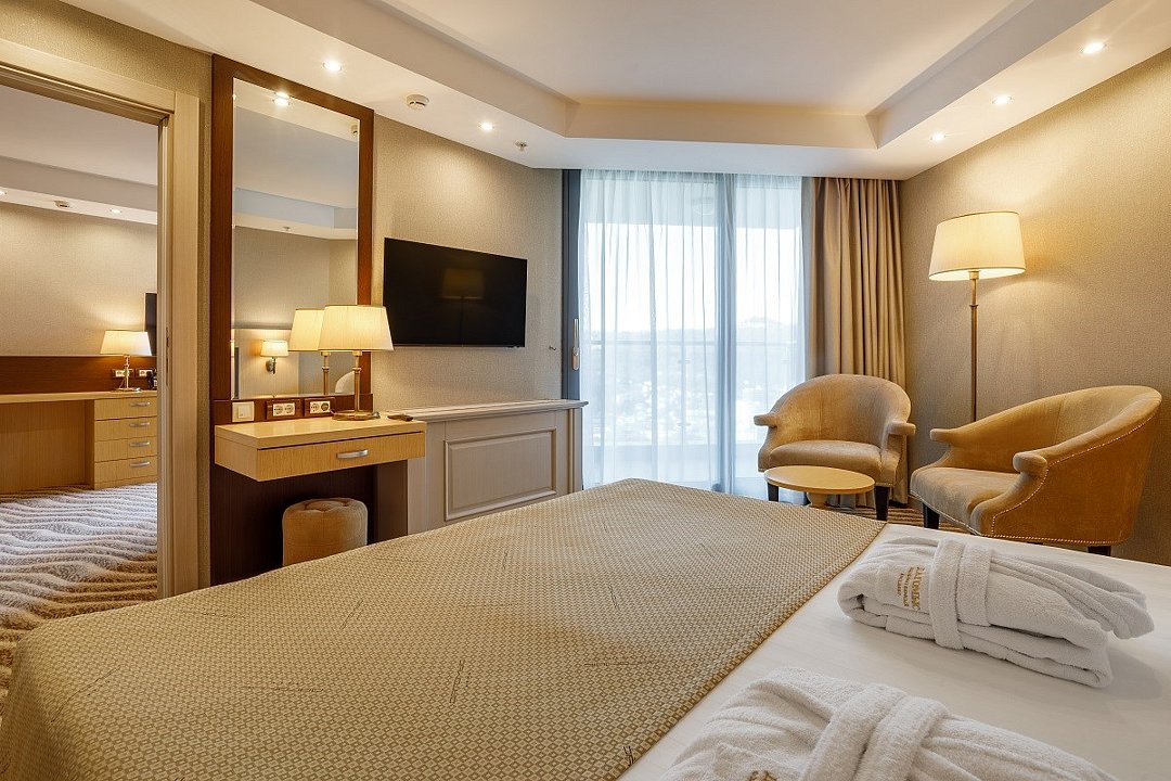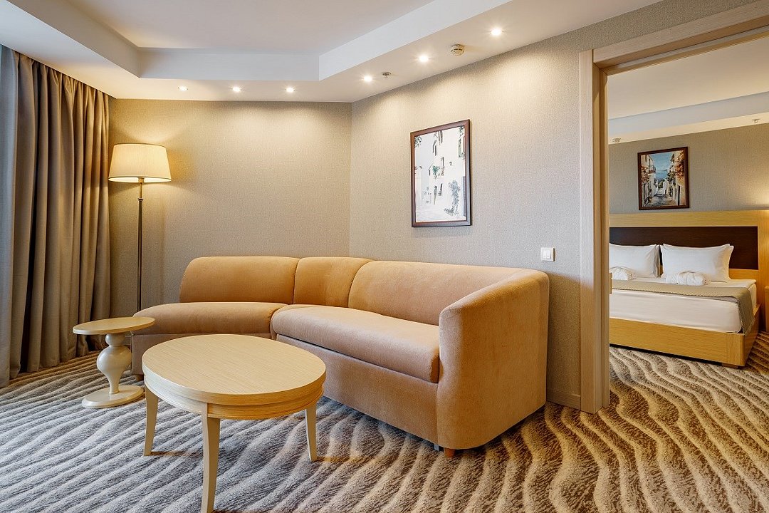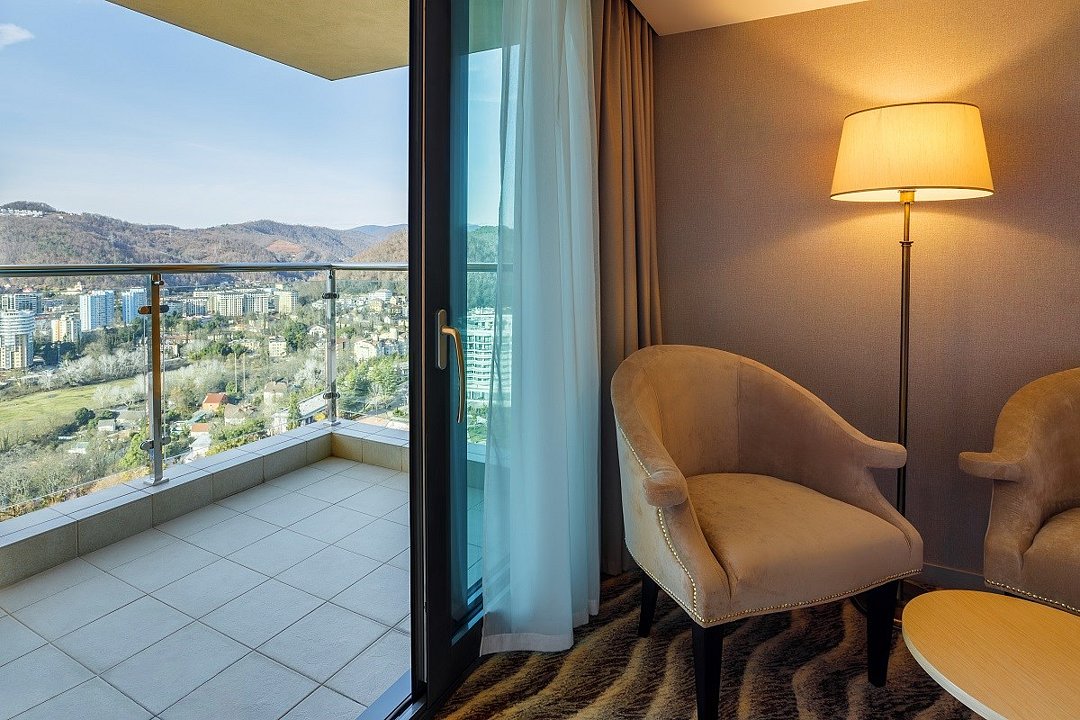 Двухкомнатный номер, площадью 52 кв.м., состоит из спальни и гостиной, идеально подходит для комфортного размещения трёх гостей. Из окон всех номеров данной категории открывается панорамный вид на Кавказские горы и на дендропарковую зону Комплекса. Стоимость номера определяется количеством человек, проживающих на основных и дополнительных местах. Дети до 5 лет принимаются бесплатно без предоставления дополнительного места. Дети в возрасте 12 лет (на день заезда) и старше относятся к категории «Взрослые». При размещении на дополнительном месте взрослого - скидка 20% от стоимости основного места; при размещении ребенка - скидка 50%. Расчетный час 12.00 московского времени. Время заезда 14.00 московского времени. Ранний заезд и поздний выезд осуществляются за дополнительную оплату.Услуги и удобства