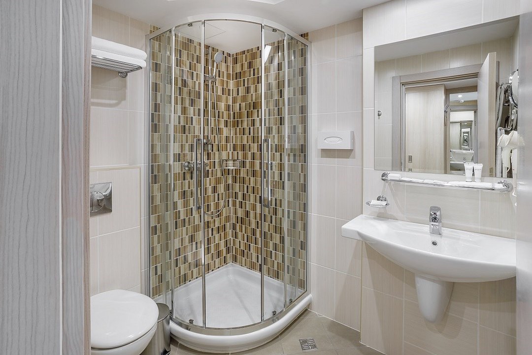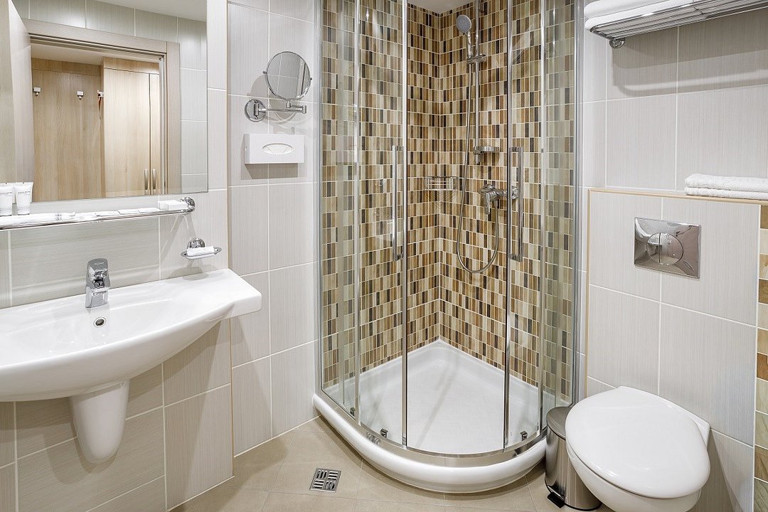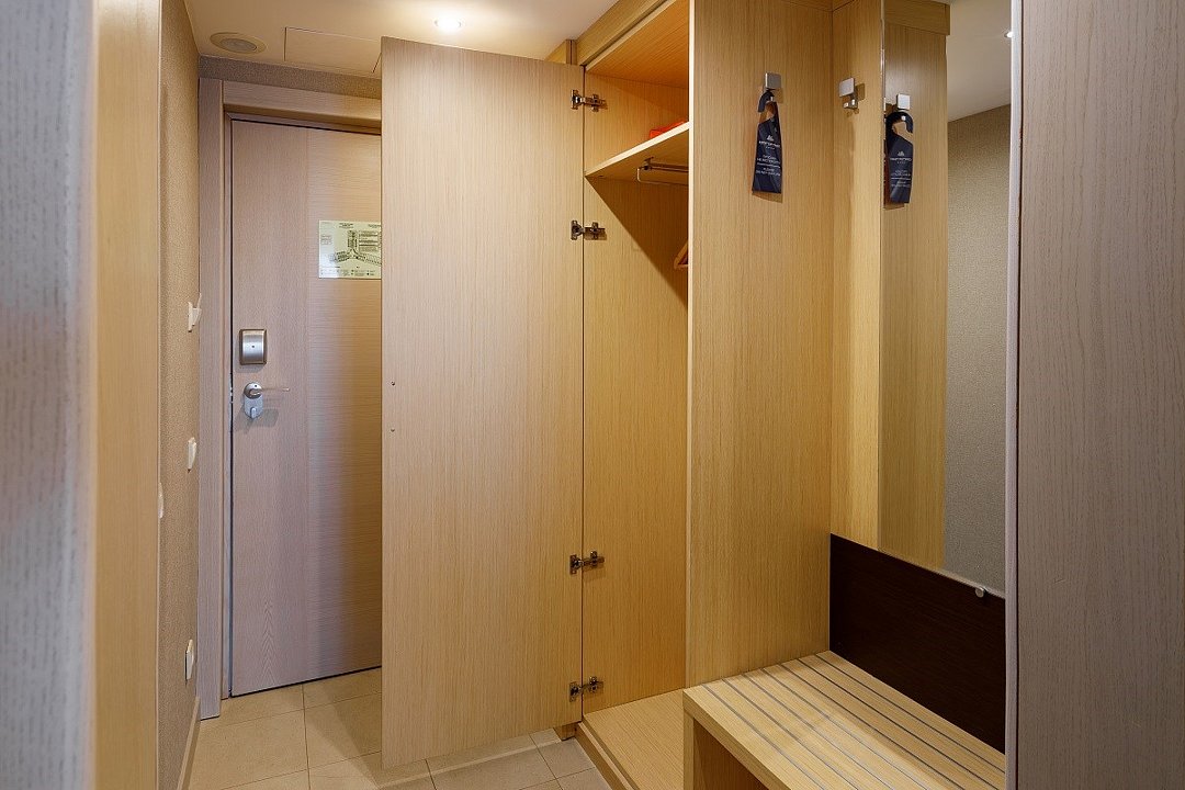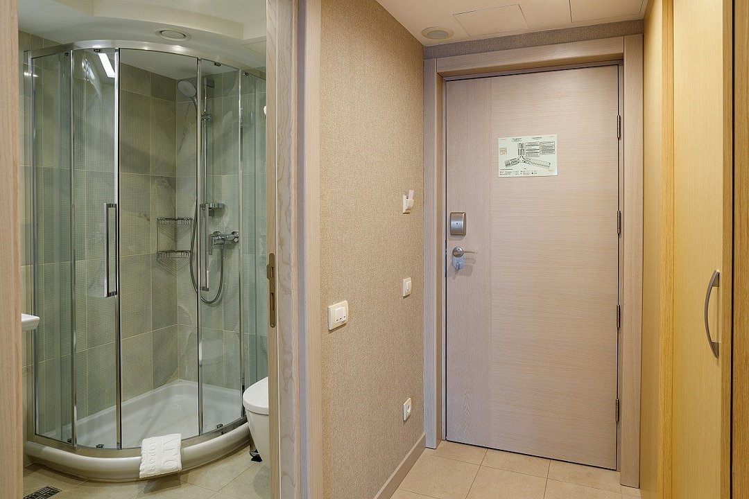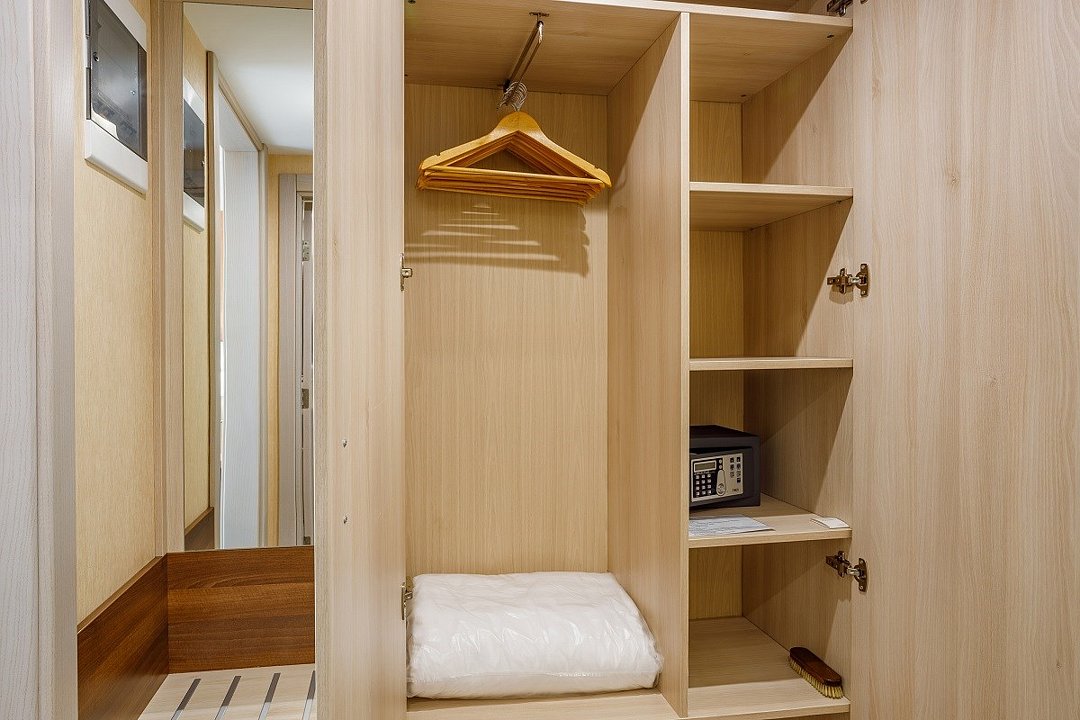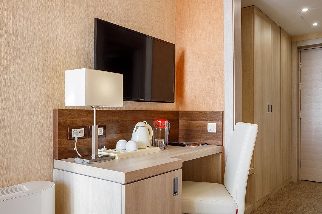 телевизор, кабельное телевидение, телефон, светильник, фен, электронные замки, ванная комната, душевая кабина, банные принадлежности, халаты, банные полотенца, тапочки, сауна, балкон, односпальная кровать, кресла, тумбы, стулья, шкаф для одежды, вешалки, письменный стол, багажная тумба, сейф, чайник, унитаз, раковина, мини-холодильник, фанкойлВ гостиничном номере