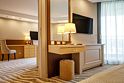 два телевизора, кабельное телевидение, телефон, светильник, фен, электронные замки, ванная комната, душевая кабина, ванна, биде, банные принадлежности, халаты, банные полотенца, тапочки, балкон, кровать «King size», диван, кресла, тумбы, стулья, шкаф для одежды, вешалки, письменный стол, багажная тумба, две комнаты, набор посуды, сейф, чайник, унитаз, раковина, мини-холодильник, фанкойлВ гостиничном номере