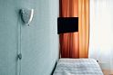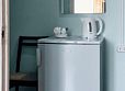 односпальная кровать, кресло, журнальный стол, тумбочка, телевизор, посуда, общие на две комнаты: душевая и туалетная комната, встроенный шкаф для одежды, холодильник, чайник, фен, гладильная доска, утюг.