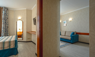 В номере: смежная гостиная: рабочее место, раскладной диван, кресло, журнальный столик, электрочайник, набор посуды и спальня: две отдельные кровати, туалетный столик. Прекрасный вид на парк «Чаир» и море. Южная сторона. Номер с балконом. Дополнительное размещение — раскладной диван для двоих взрослых.