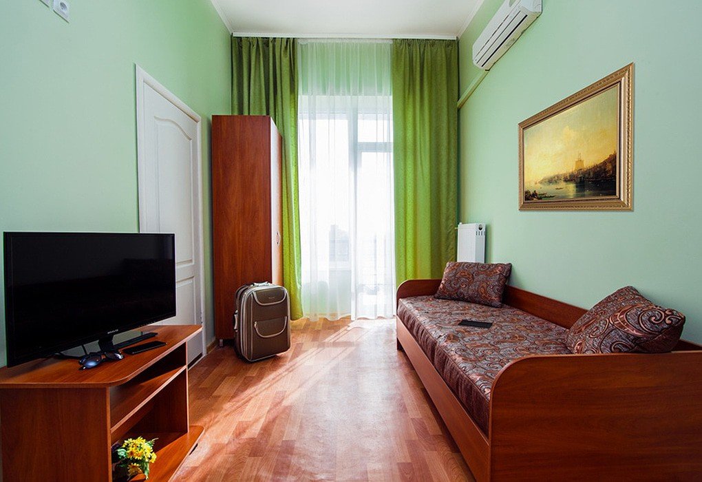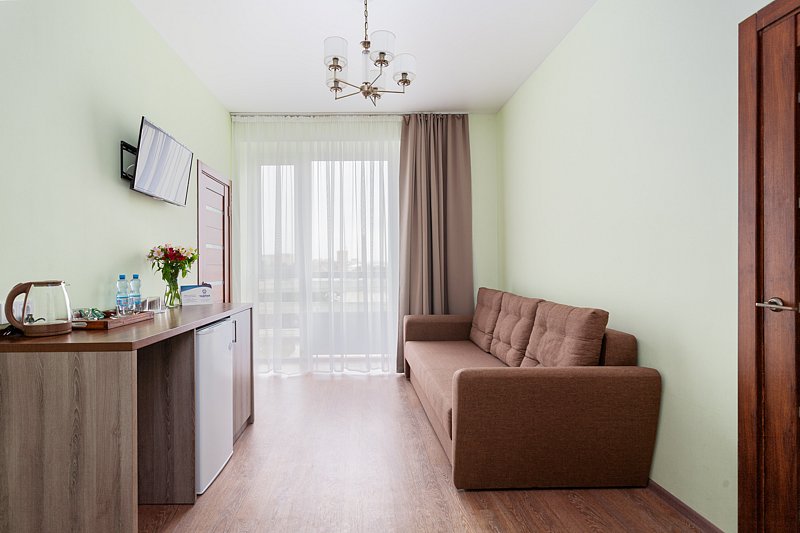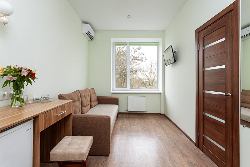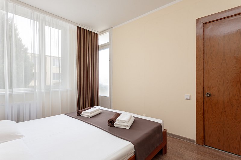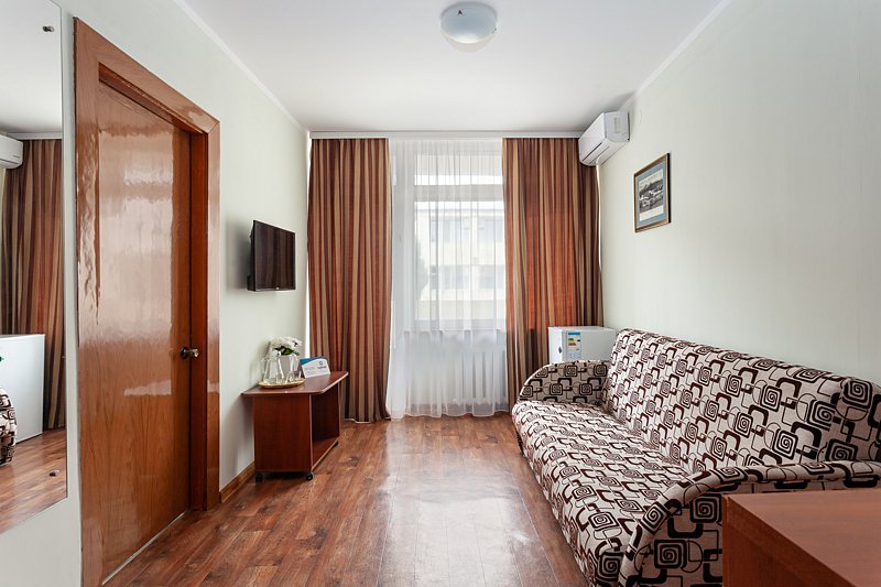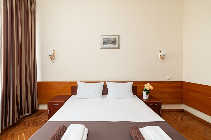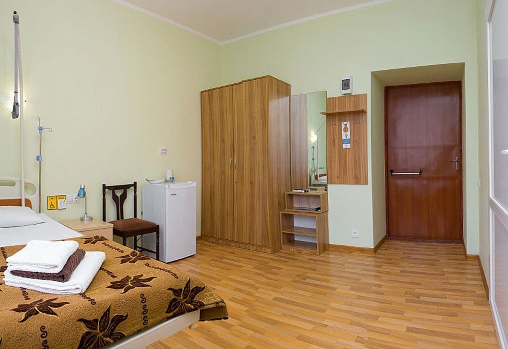 Однокомнатный номер с балконом в корпусе № 1, прошедшем капитальную реконструкцию в 2016 году, с видом на живописный парк санатория, максимально полная комплектация номера для длительного комфортного проживания в санатории и результативного лечения в Крыму.