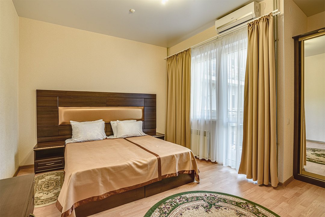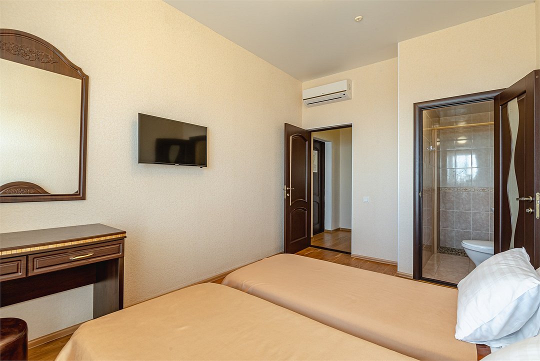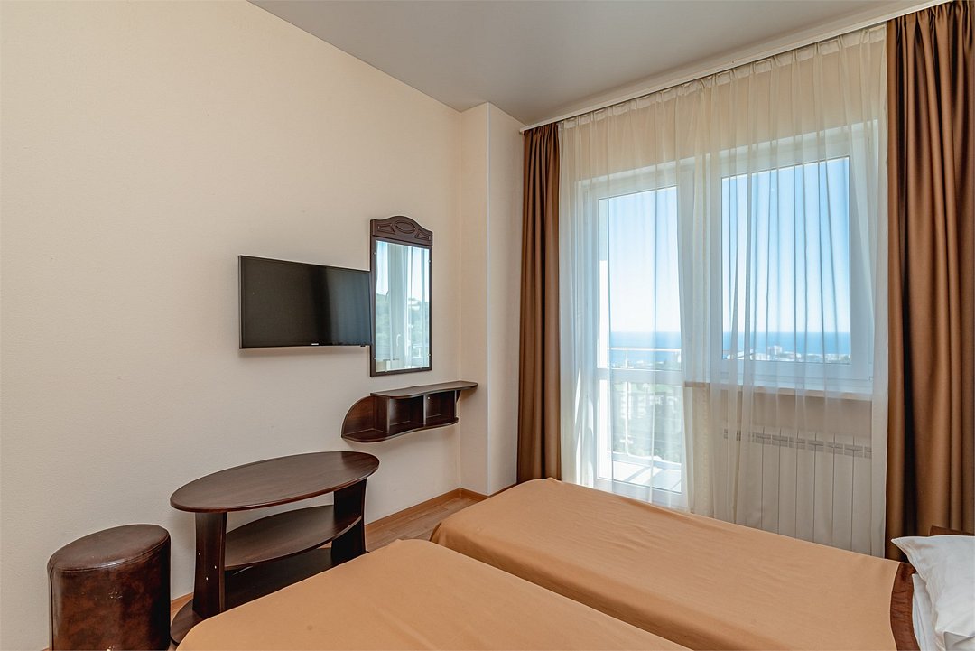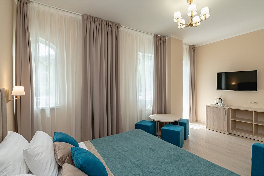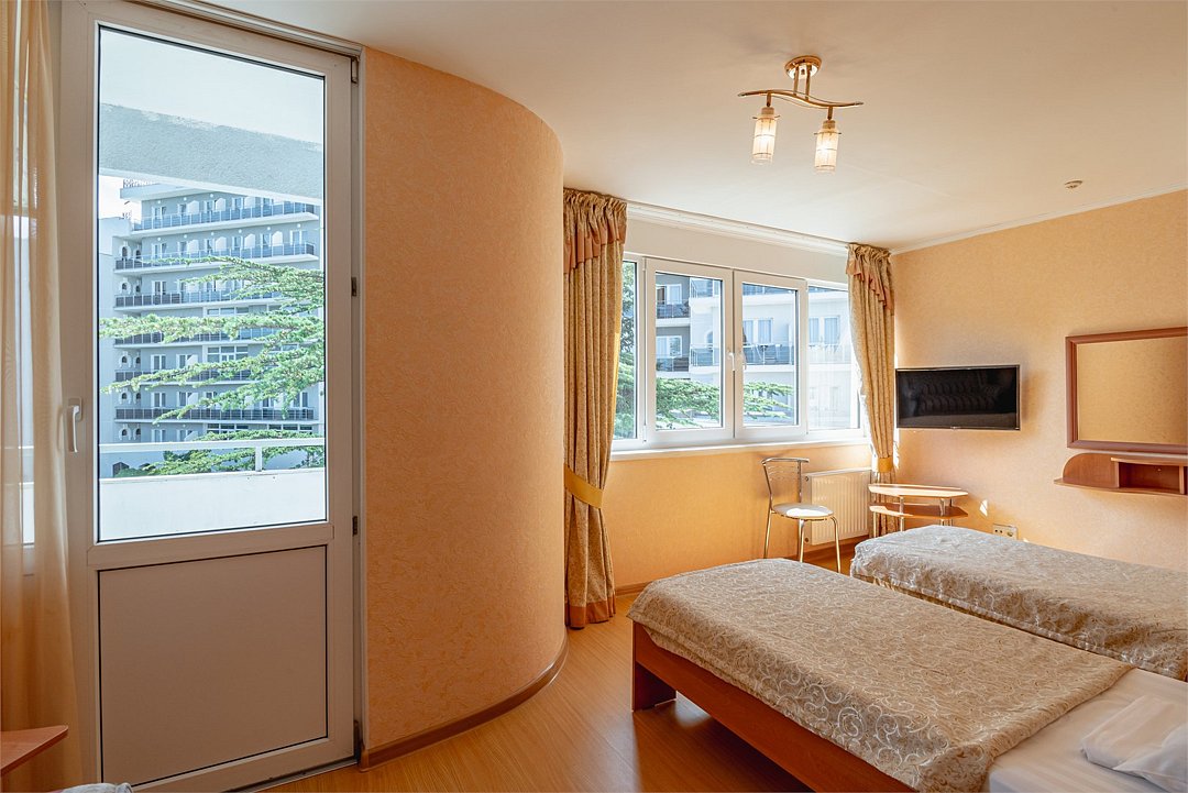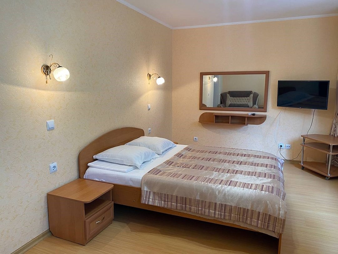 Стандарт улучшенный, с современным дизайном, с -2-х спальной кроватью и доп.местом диван-кровать, площадь 23 кв.м. Комната, коридор, сан. узел, с прекрасным видом на парк. Кондиционер, телевизор, холодильник, электрический чайник, посуда. В санузлах - душевая кабина, умывальник. Вид на парк. Номера расположены со 2 по 5 этаж. Корпус с лифтом. Проживание с животными категорически запрещено. В стоимость путевки входит: - 3-разовое питание по комплексному меню - комплекс медицинских процедур на основании Вашей санаторно-курортной карты - посещение бассейна/тренажерного зала - трансфер на набережную/пляж (в зависимости от сезона) - парковочное местоУслуги и удобства
