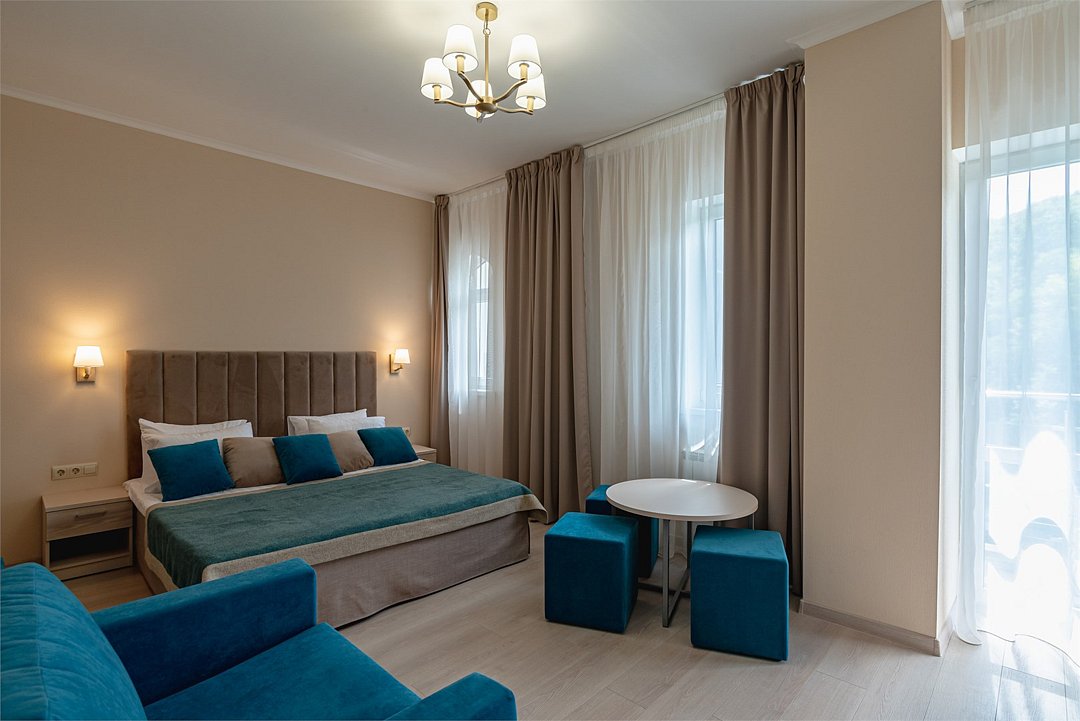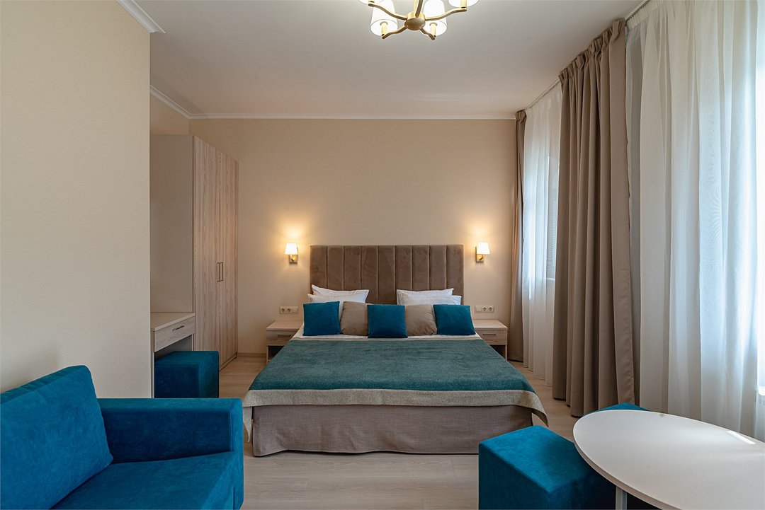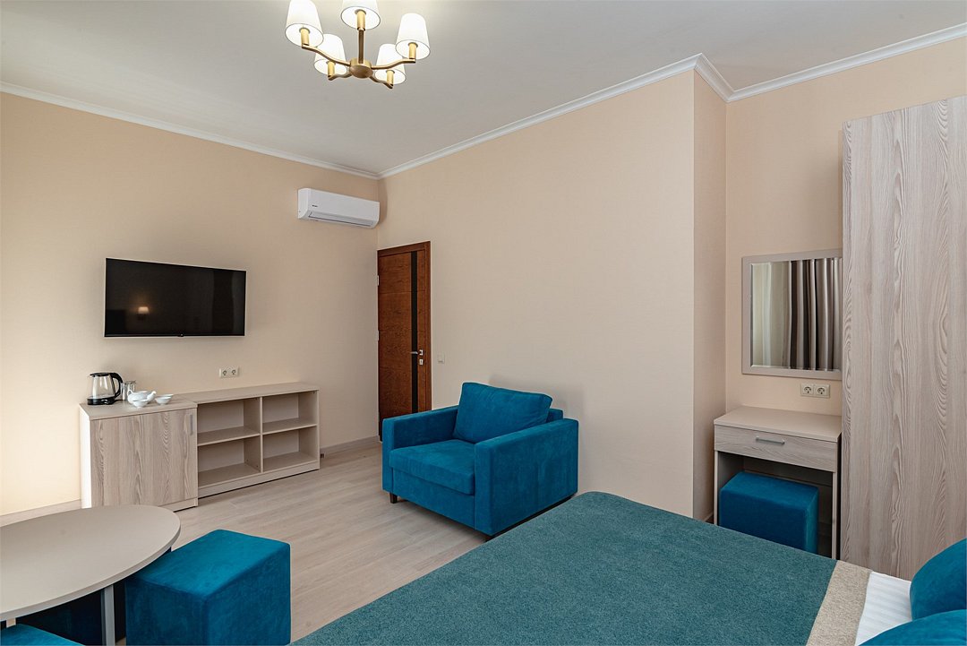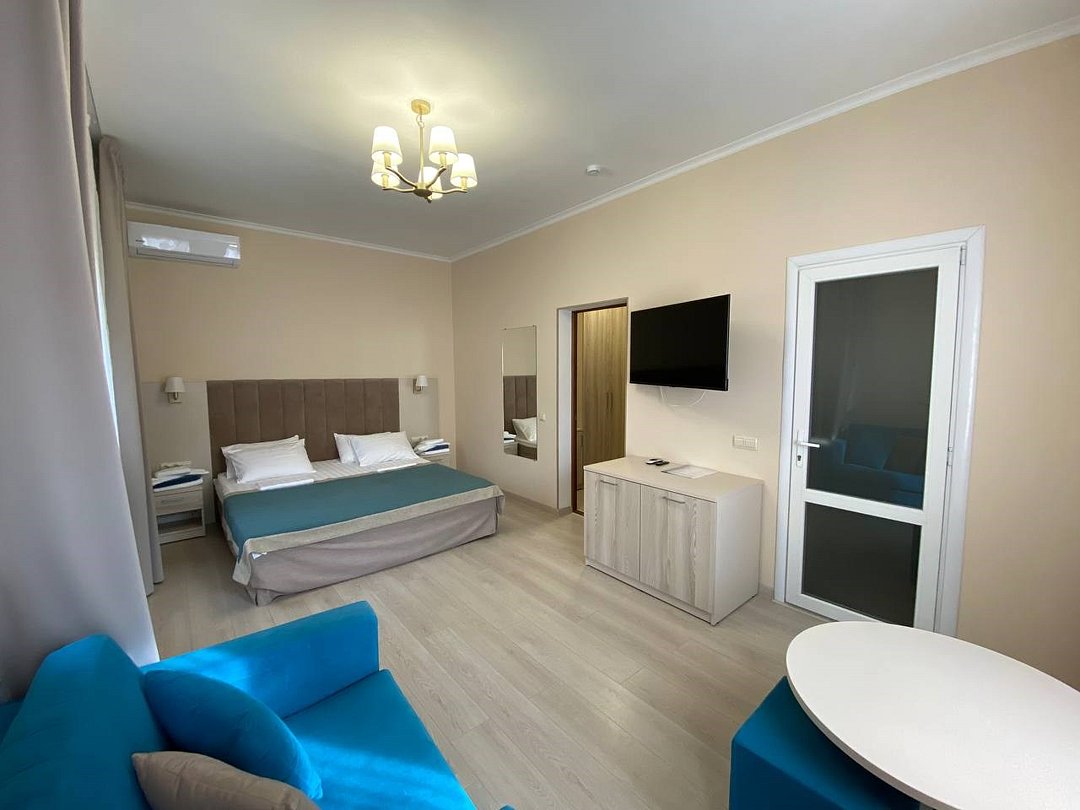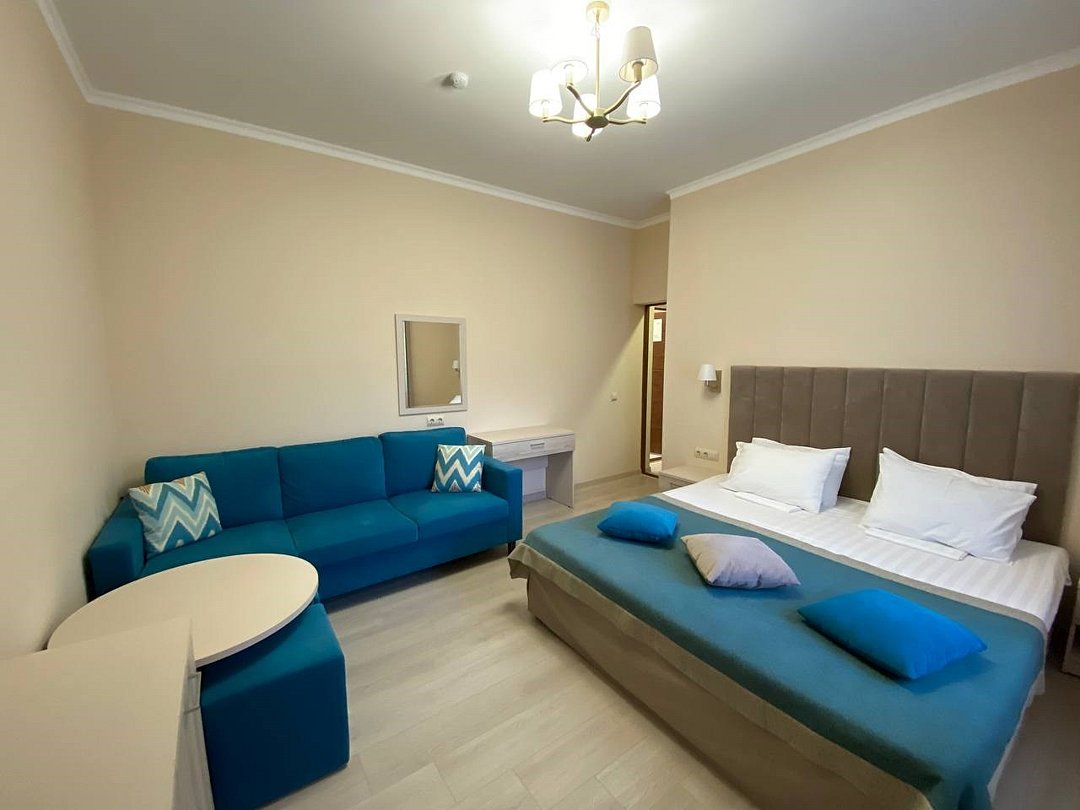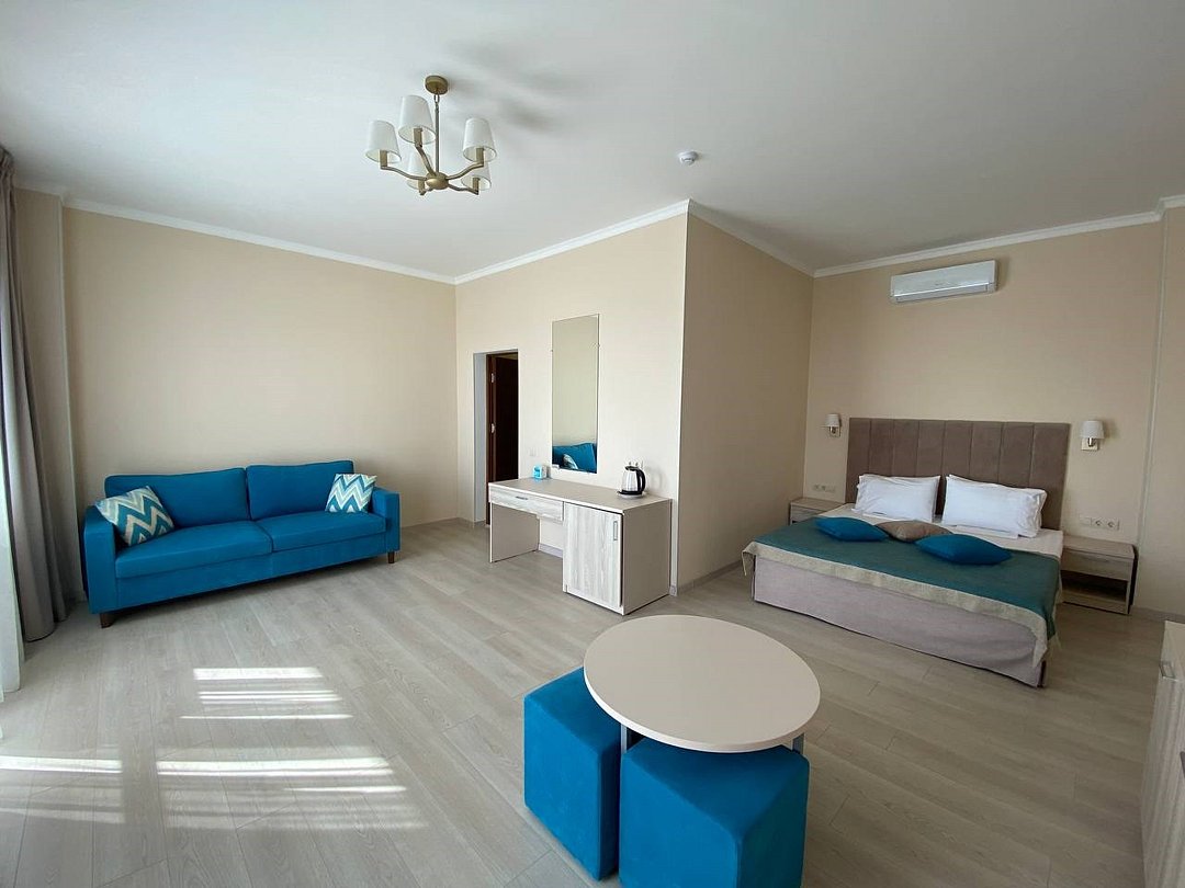 Люкс однокомнатный, с современным дизайном, с -2-х спальной кроватью и доп.местом диван-кровать, площадь 40 кв.м. Комната, коридор, сан. узел, номер с прекрасным видом на море. Кондиционер, телевизор, холодильник, электрический чайник, посуда. В санузлах - душевая кабина, умывальник. Номера расположены со 2 по 5 этаж. Корпус с лифтом. Проживание с животными категорически запрещено. В стоимость путевки входит: - 3-разовое питание по комплексному меню - комплекс медицинских процедур на основании Вашей санаторно-курортной карты - посещение бассейна/тренажерного зала - трансфер на набережную/пляж (в зависимости от сезона) - парковочное местоУслуги и удобства