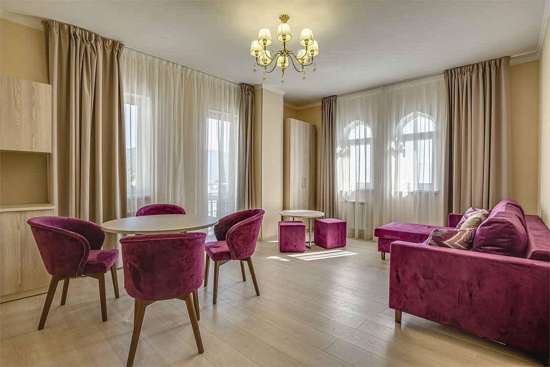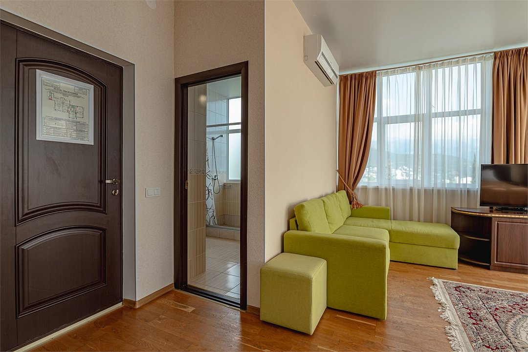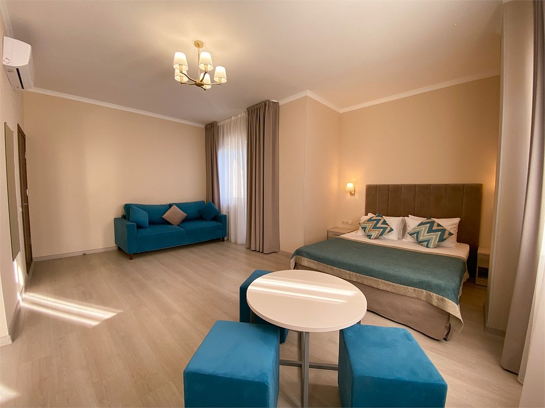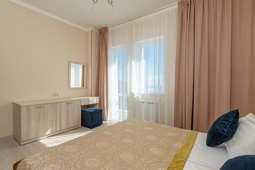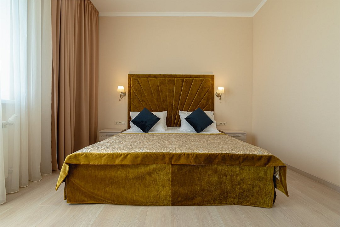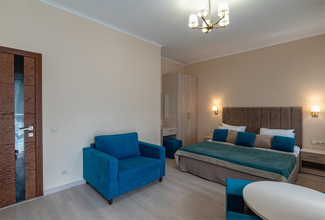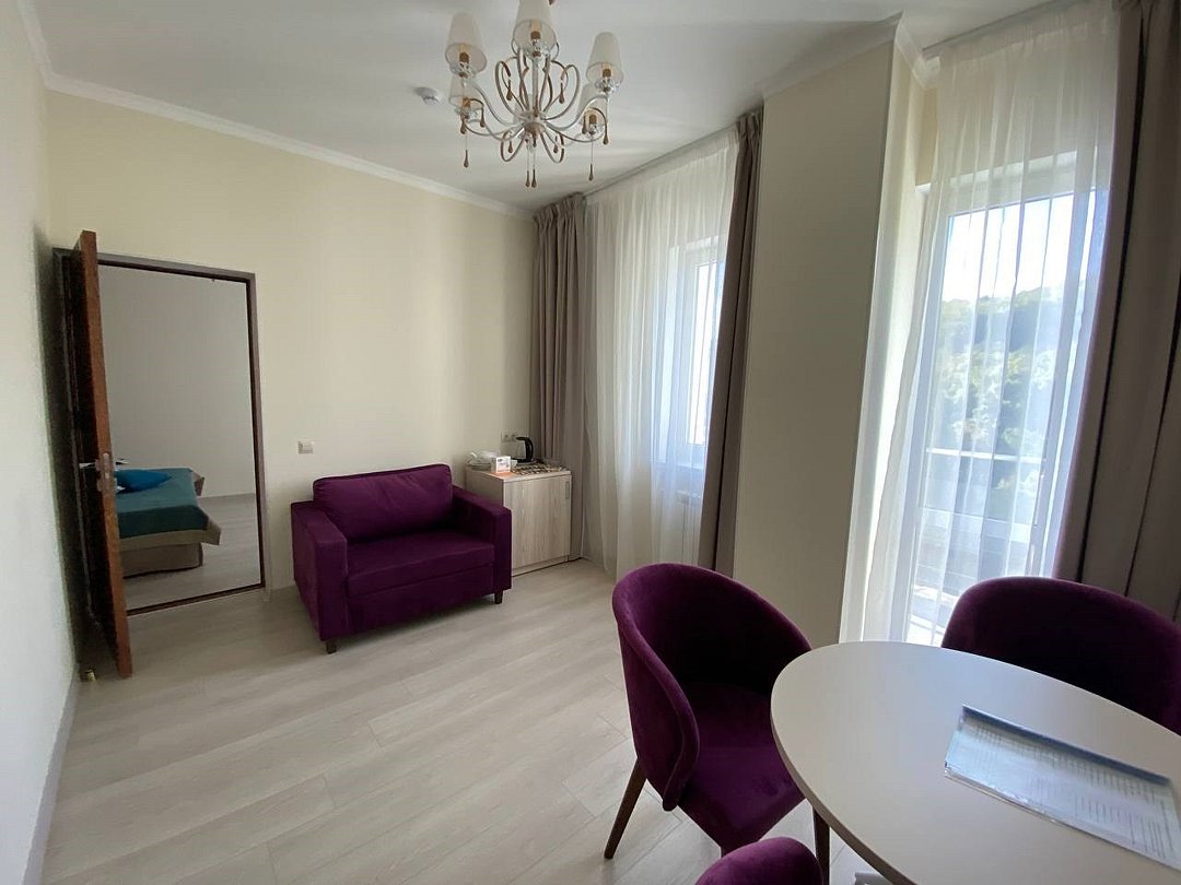 Люкс однокомнатный, с современным дизайном, с -2-х спальной кроватью и доп.местом диван-кровать, площадь 40 кв.м. Комната, коридор, сан. узел, номер с прекрасным видом на море. Кондиционер, телевизор, холодильник, электрический чайник, посуда. В санузлах - душевая кабина, умывальник. Номера расположены со 2 по 5 этаж. Корпус с лифтом. Проживание с животными категорически запрещено. В стоимость путевки входит: - 3-разовое питание по комплексному меню - комплекс медицинских процедур на основании Вашей санаторно-курортной карты - посещение бассейна/тренажерного зала - трансфер на набережную/пляж (в зависимости от сезона) - парковочное местоУслуги и удобства