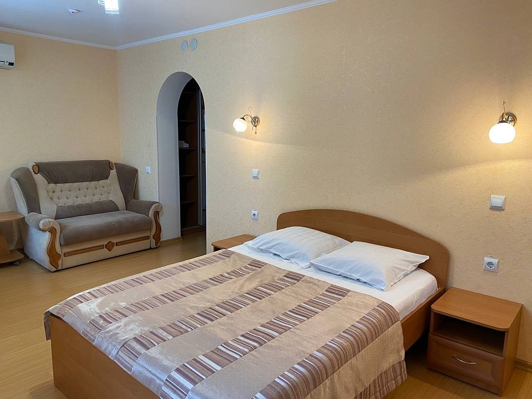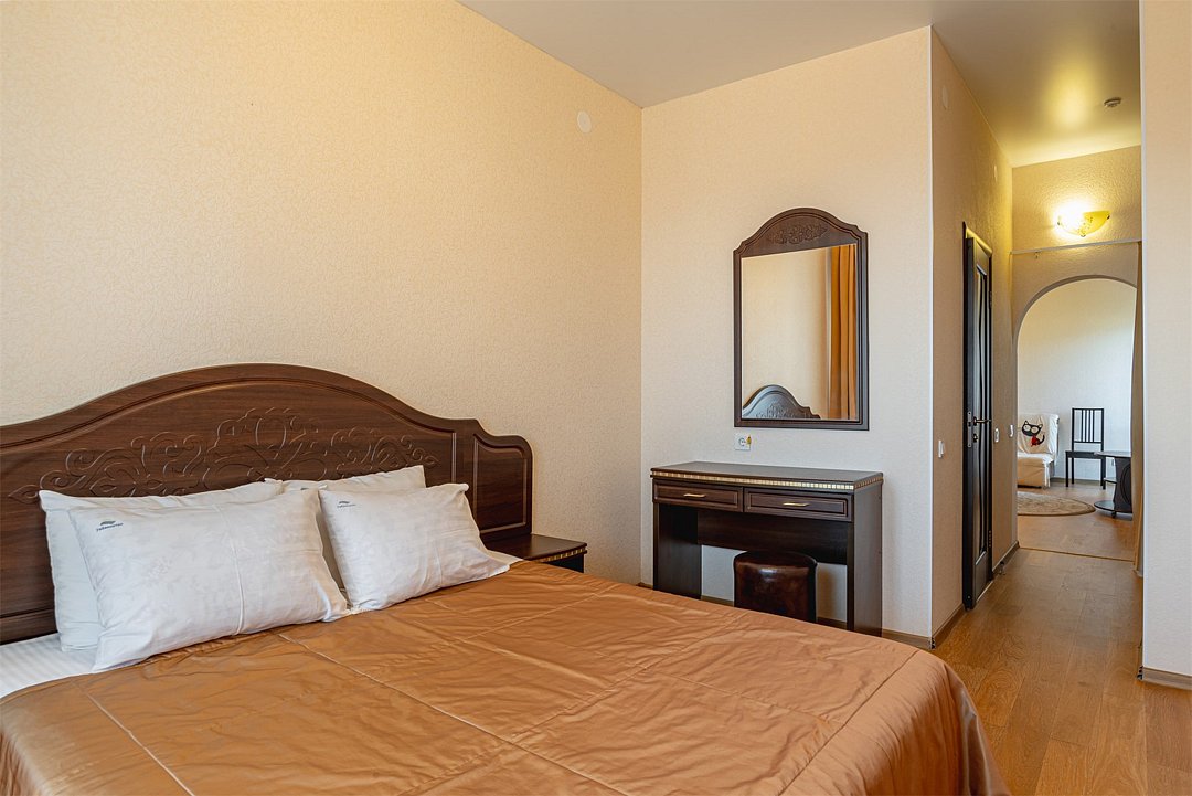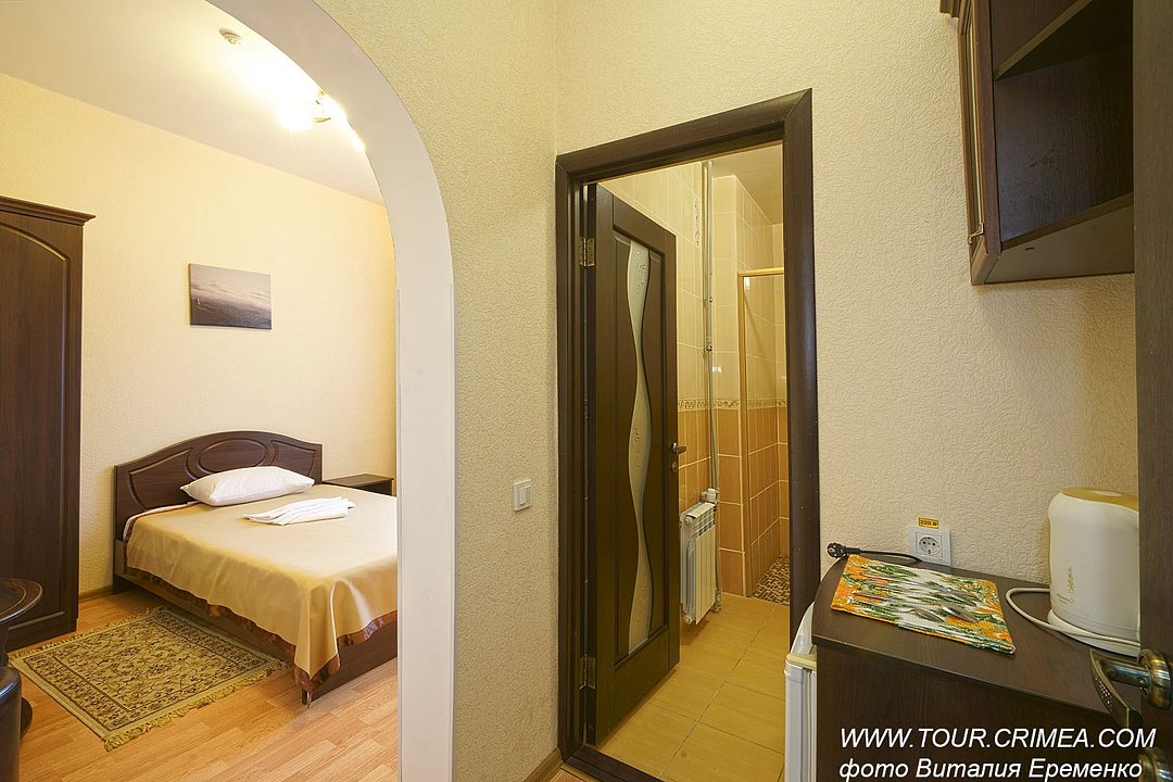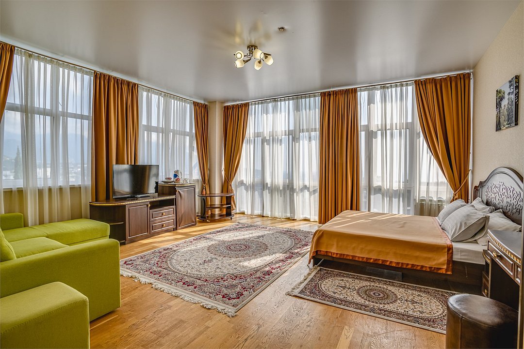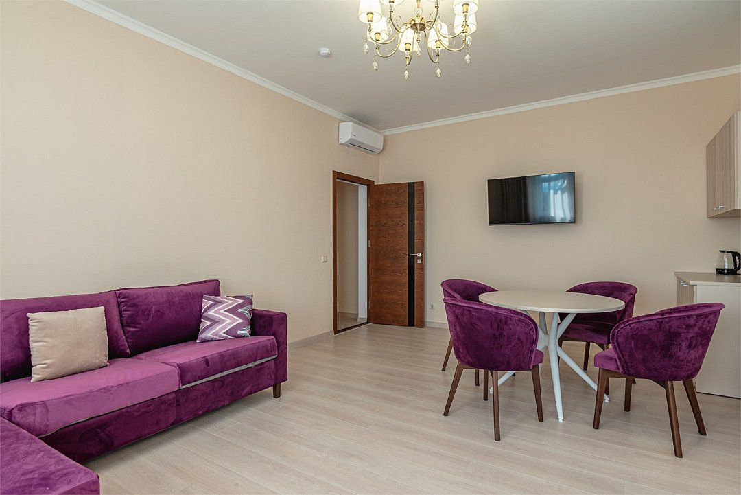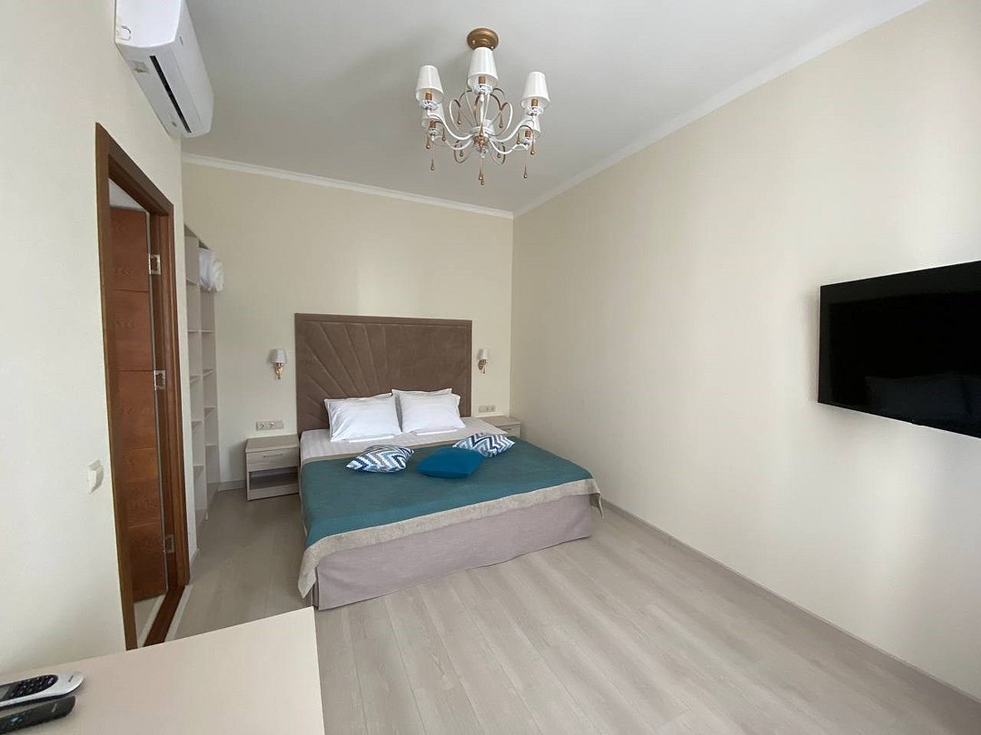Люкс однокомнатный, с современным дизайном, с -2-х спальной кроватью и доп.местом диван-кровать, площадь 40 кв.м. Комната, коридор, сан. узел, номер с прекрасным видом на море. Кондиционер, телевизор, холодильник, электрический чайник, посуда. В санузлах - душевая кабина, умывальник. Номера расположены со 2 по 5 этаж. Корпус с лифтом. Проживание с животными категорически запрещено. В стоимость путевки входит: - 3-разовое питание по комплексному меню - комплекс медицинских процедур на основании Вашей санаторно-курортной карты - посещение бассейна/тренажерного зала - трансфер на набережную/пляж (в зависимости от сезона) - парковочное местоУслуги и удобства