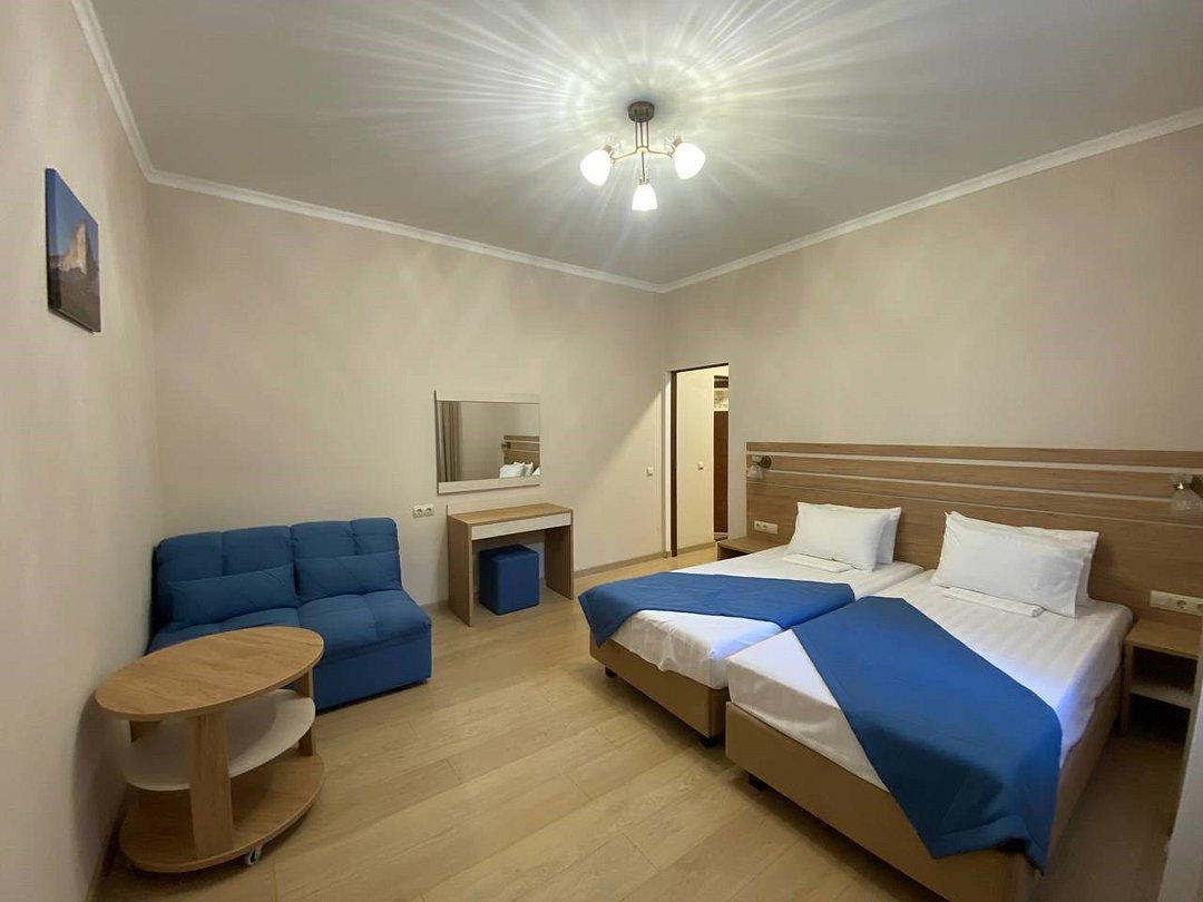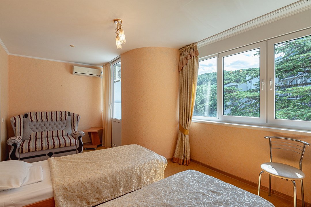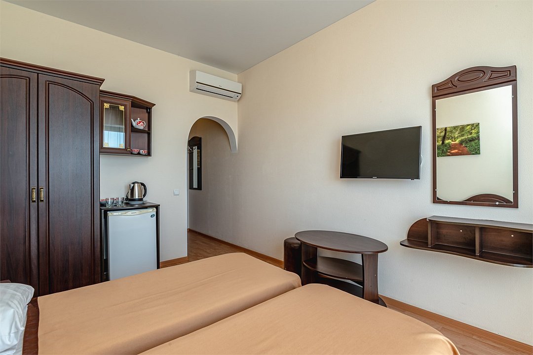 Wi-Fi, холодильник, кондиционер, ванная комната, банные полотенца, пляжные полотенца, балкон, две односпальные кровати, шкаф для одежды, вешалки, журнальный столик, зеркало, пуфики, чайный набор, чайник, унитаз, раковина, вид на море, стаканы, столовые приборы, стул, тумба, туалетные средства, вид на парк, диван-кровать, раскладной диван, телевизор с плоским экраном, вид на горы, номер для некурящих, вид на лесВ номере