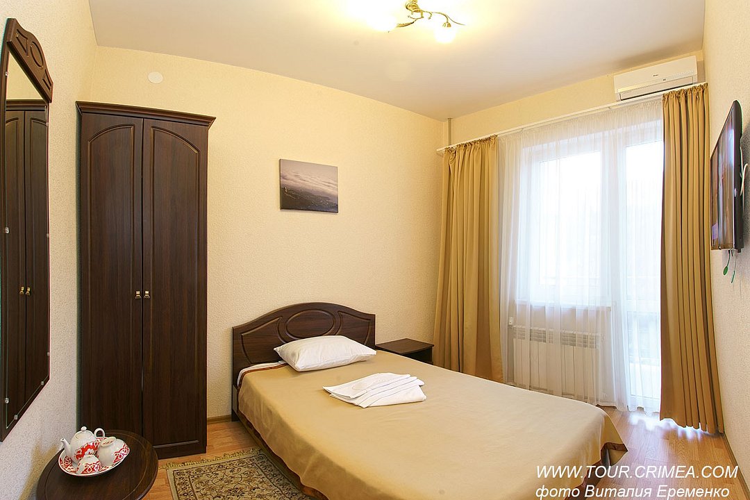Номера со всеми удобствами,три комнаты,три балкона с видом на море,горы.Балконной мебели нет. Номера расположены на 3, 4, 5 и 7 этаже. Корпус с лифтом. Проживание с животными категорически запрещено. В стоимость путевки входит: - 3-разовое питание по комплексному меню - комплекс медицинских процедур на основании Вашей санаторно-курортной карты - посещение бассейна/тренажерного зала - трансфер на набережную/пляж (в зависимости от сезона) - парковочное местоУслуги и удобства