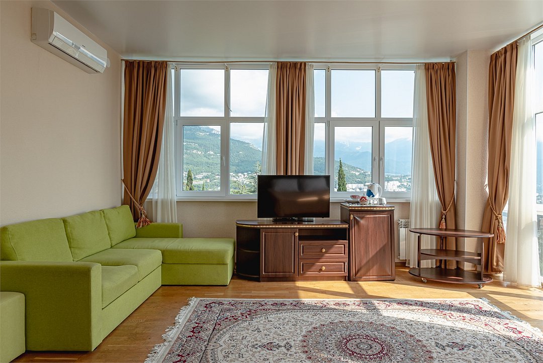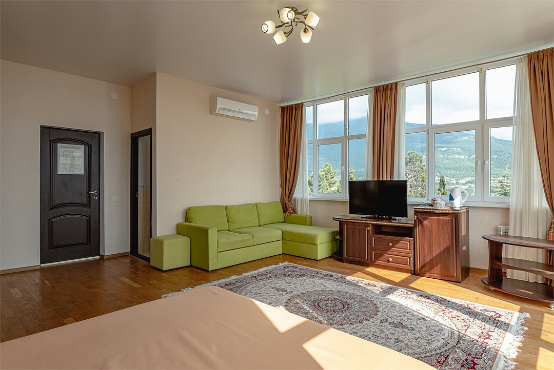 Wi-Fi, кондиционер, душевая кабина, банные полотенца, пляжные полотенца, тапочки, балкон с красивым видом, двуспальная кровать, тумбы, вешалки, журнальный столик, зеркало, пуфики, две комнаты, чайный набор, чайник, унитаз, раковина, ковровое покрытие, стаканы, столовые приборы, туалетные средства, диван-кровать, раскладной диван, телевизор с плоским экраном, мини-кухня, шкаф-купе, вид на горы, номер для некурящих, вид на лес, холодильный шкафВ номере