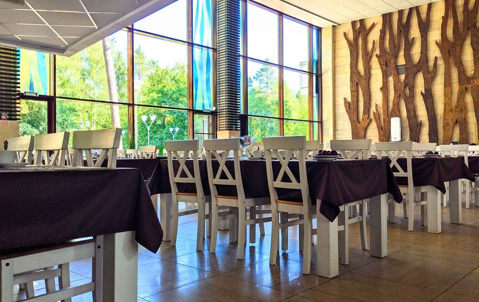 К услугам гостей три великолепно оборудованных обеденных зала. Гостям предлагается широкий выбор закусок, первых и вторых блюд. Лечебное питание предусматривает стандартные диеты для отдыхающих.