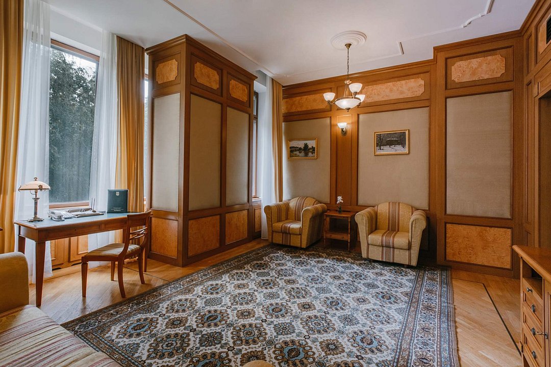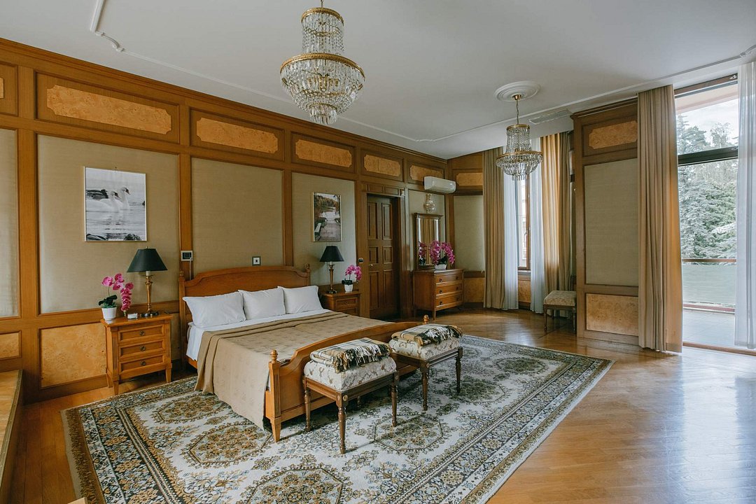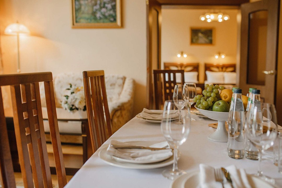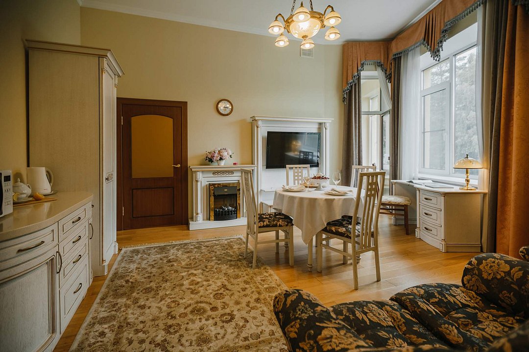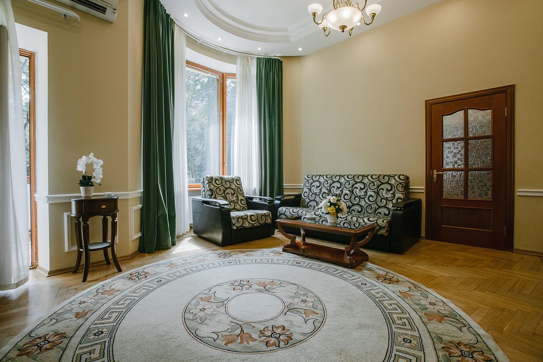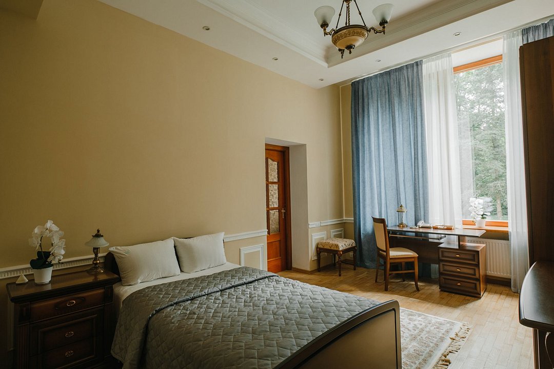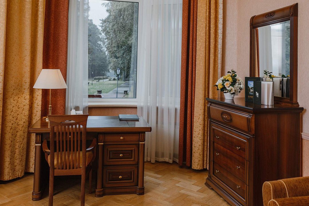 Санаторий занимает благоустроенную территорию площадью 80 гектаров и состоит из нескольких двух-, трех- и четырехэтажных жилых корпусов. Гостей ожидают комфортабельные номера категорий Люкс, Сьют, Улучшенный. Просторные номера, оформленные в классическом стиле, укомплектованы удобным мебельным гарнитуром, бытовой техникой – кондиционером, телевизором, холодильником, феном, в санузлах, в зависимости от выбранного категории – душевая кабина или ванная. В четырехкомнатном президентском номере имеется оборудованная кухня и рабочий кабинет.