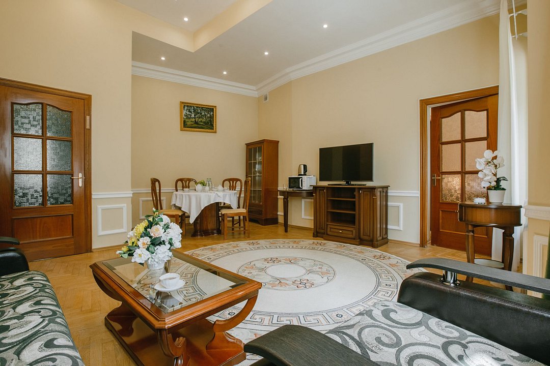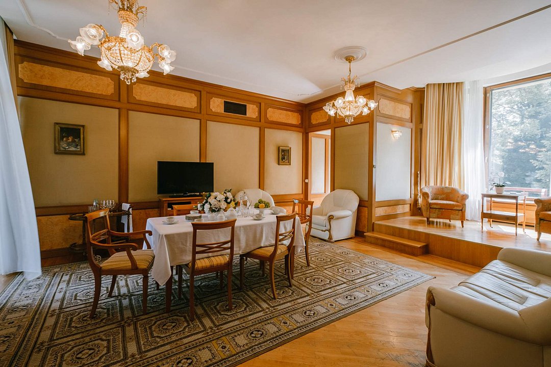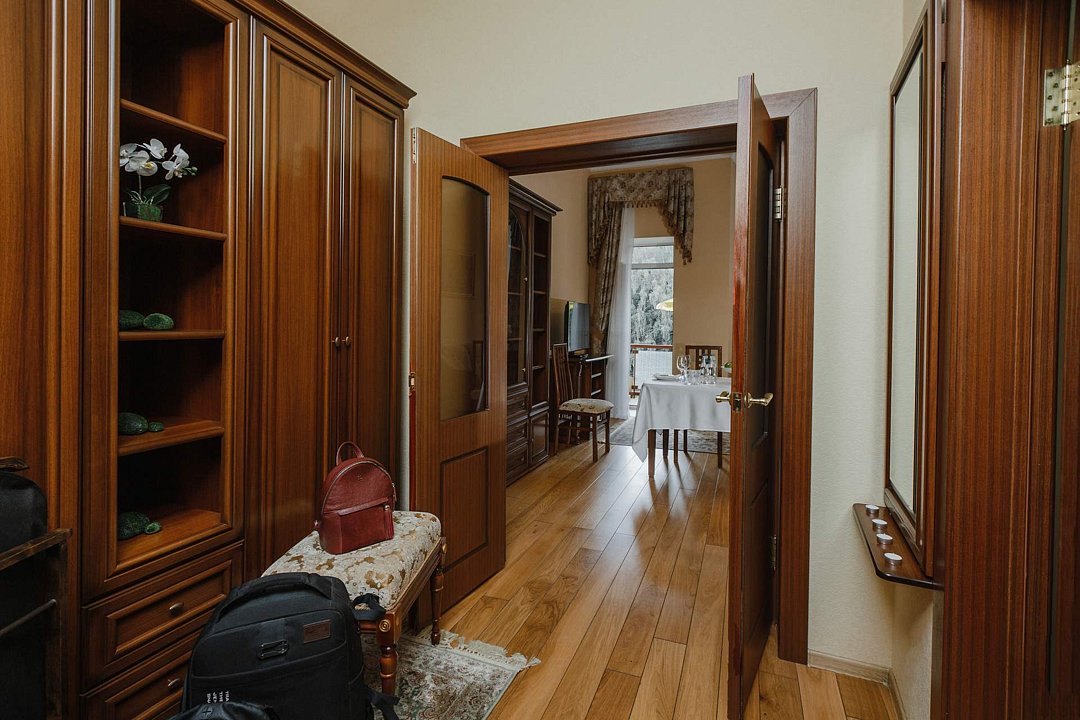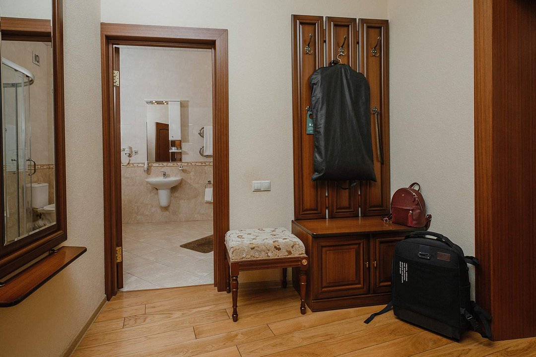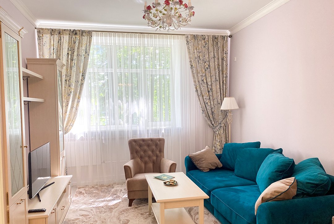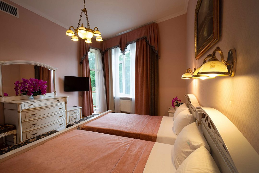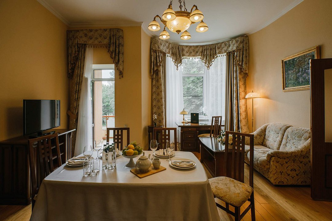 Санаторий занимает благоустроенную территорию площадью 80 гектаров и состоит из нескольких двух-, трех- и четырехэтажных жилых корпусов. Гостей ожидают комфортабельные номера категорий Люкс, Сьют, Улучшенный. Просторные номера, оформленные в классическом стиле, укомплектованы удобным мебельным гарнитуром, бытовой техникой – кондиционером, телевизором, холодильником, феном, в санузлах, в зависимости от выбранного категории – душевая кабина или ванная. В четырехкомнатном президентском номере имеется оборудованная кухня и рабочий кабинет.