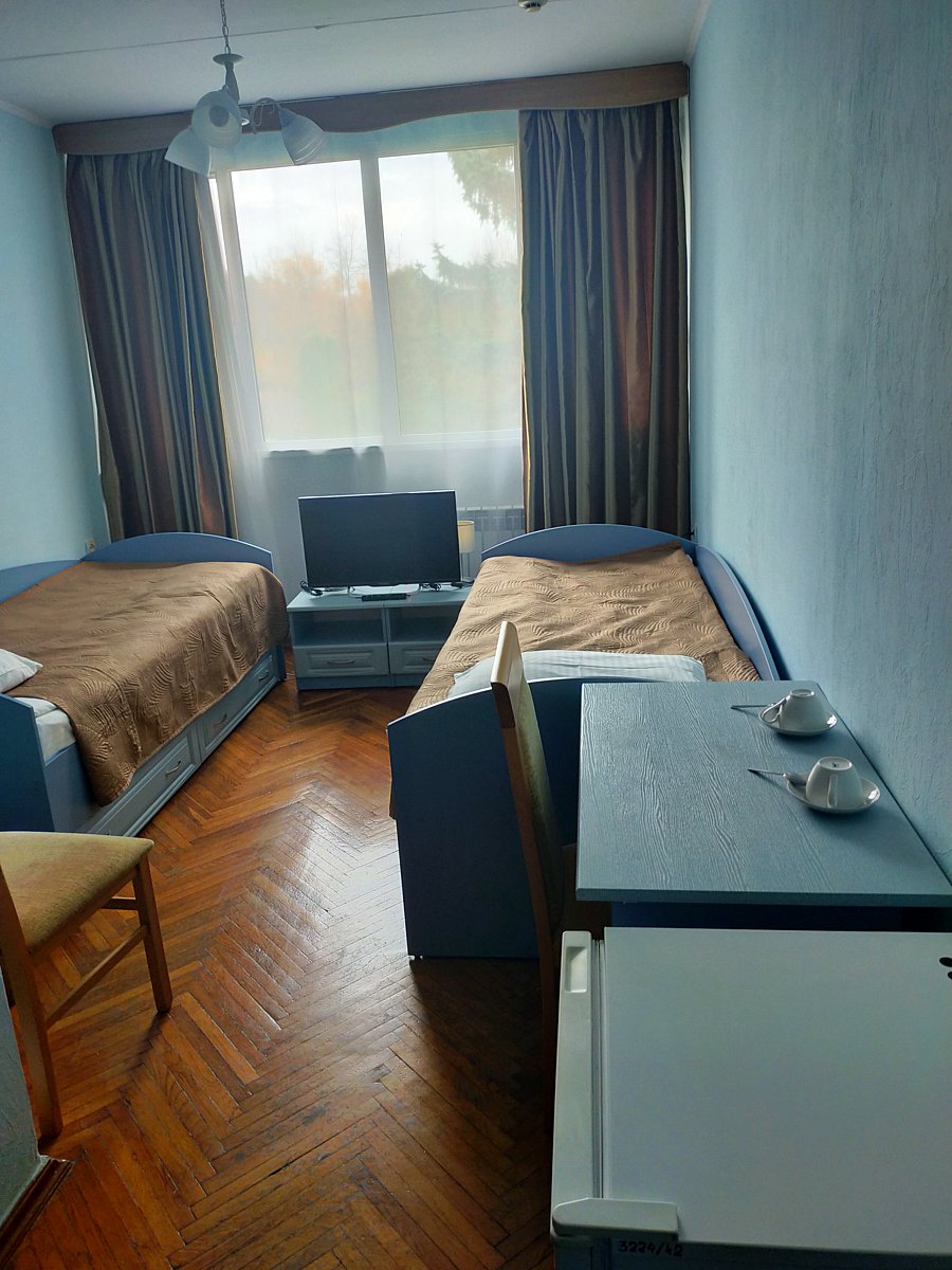 Однокомнатный номер с 2-мя полутороспальной кроватями, оснащен современной мебелью, плазменным телевизором, холодильником, чайной посудой, в ванной комнате душевая кабина.
