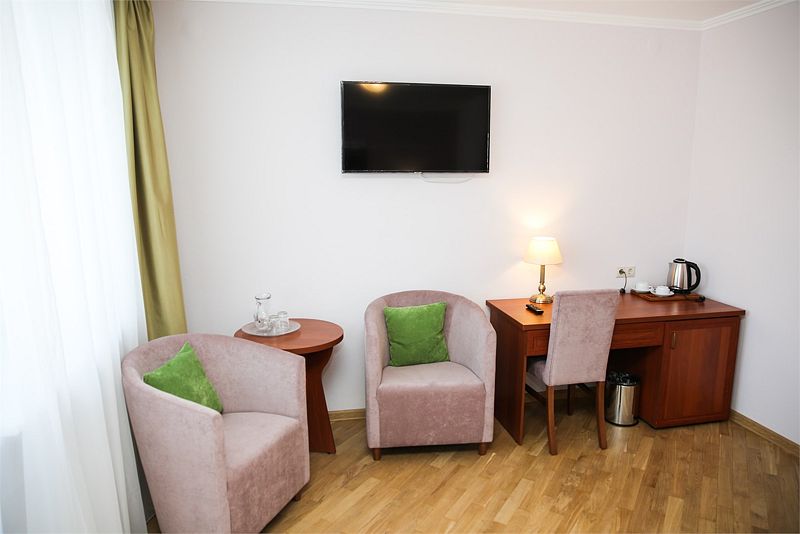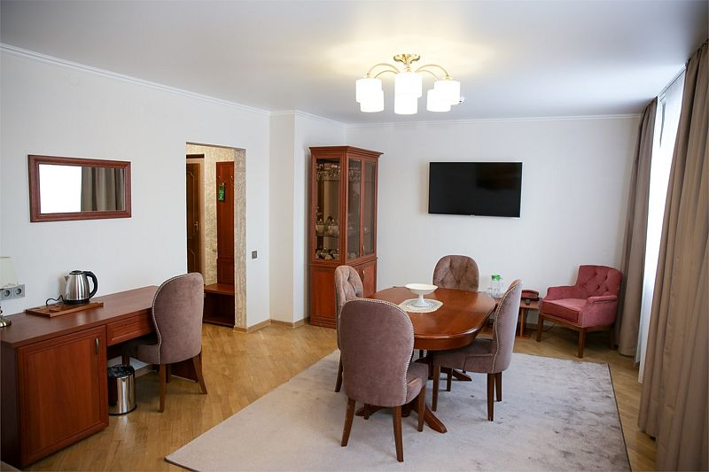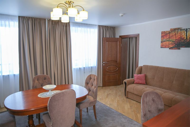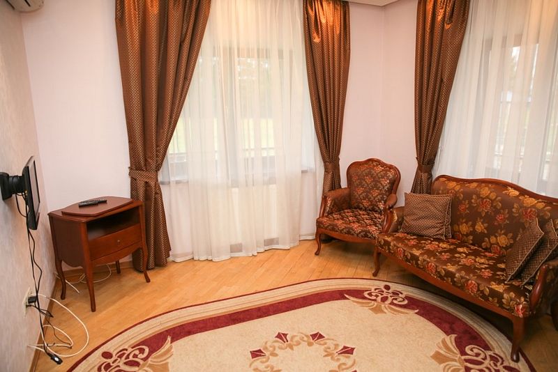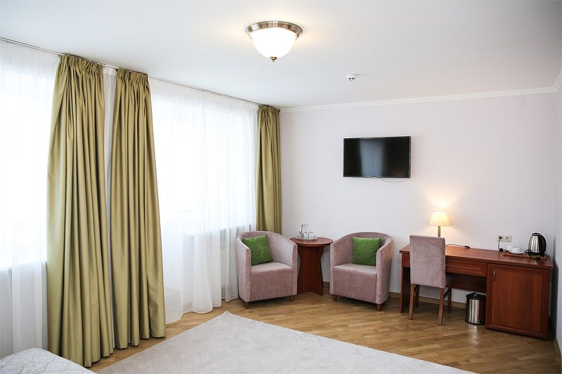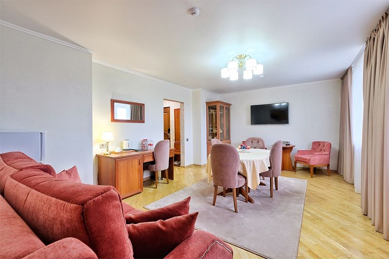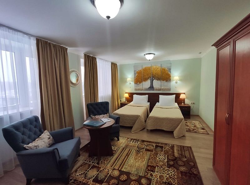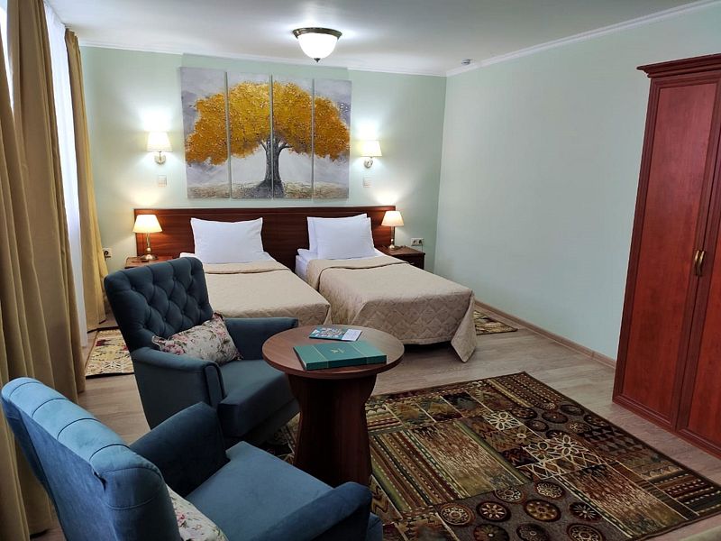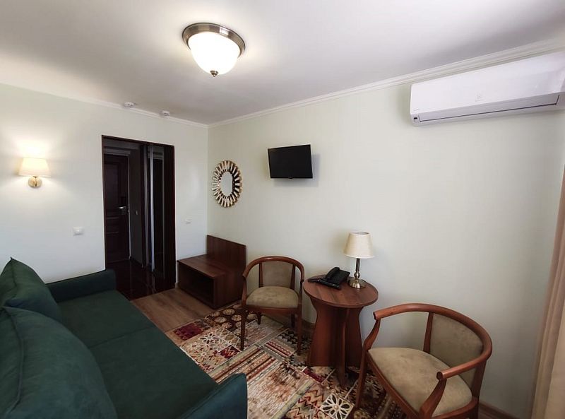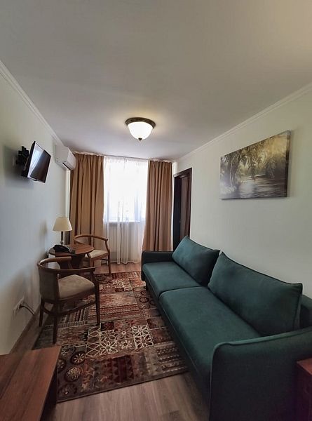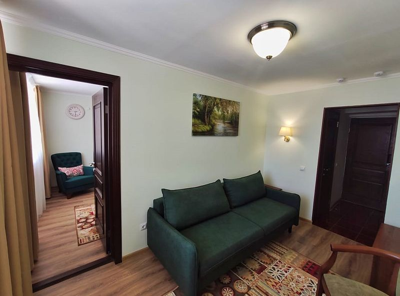 Двухкомнатный номер со всеми удобствами. Дополнительное место – диван. Расположен во 2 корпусе.