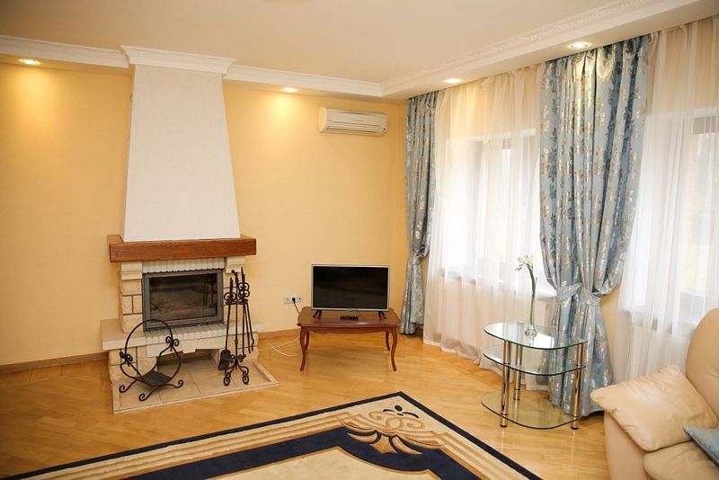На 2 этаже: гостиная с камином, спальная комната с 2-спальной кроватью, гардеробная, просторная гостевая комната-кабинет.