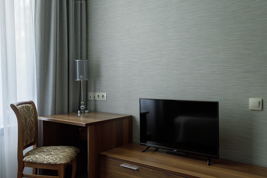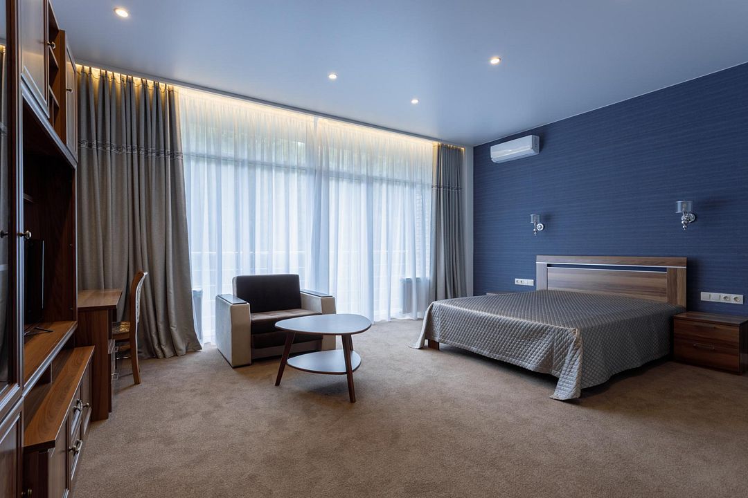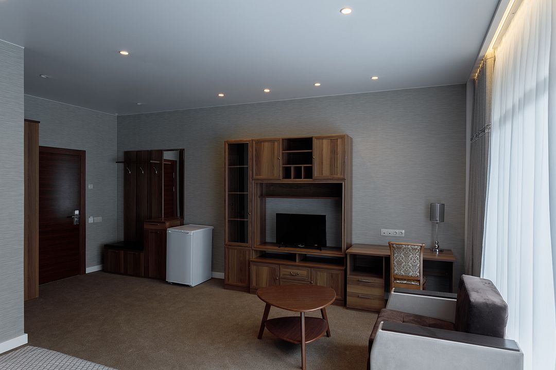 На охраняемой территории площадью более ста тридцати гектаров гармонично разместились три жилых корпуса. Гостям предлагаются уютные номера, оборудованные современной мебелью, необходимой бытовой техникой и санузлом с душевой кабиной.