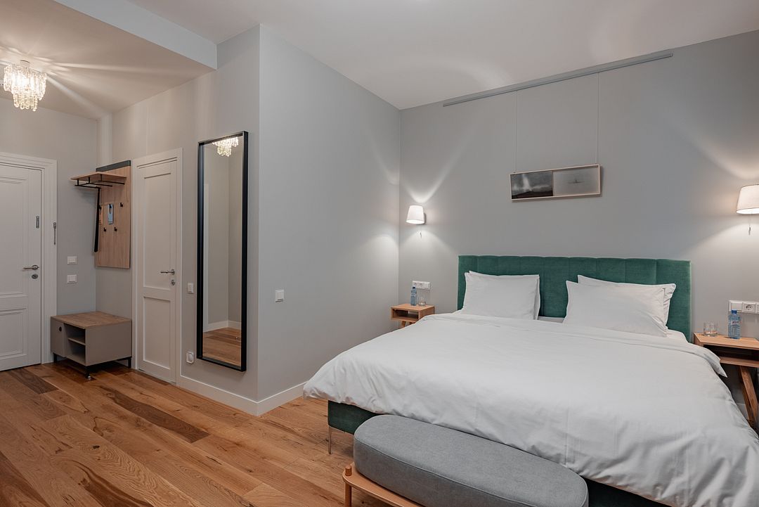 Уютный номер, с большой двуспальной кроватью, душевой, оборудован всем необходимым для комфортного пребывания в арт-санатории Изовела.