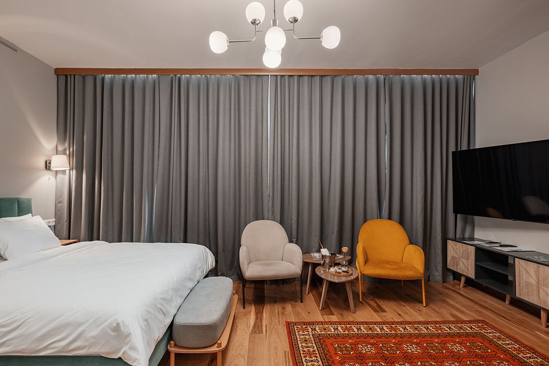 Уютный номер, с видом на горы, большой двуспальной кроватью, ванной комнатой, балконом, отдельной прихожей, оборудован всем необходимым для комфортного пребывания в арт-санатории Изовела.