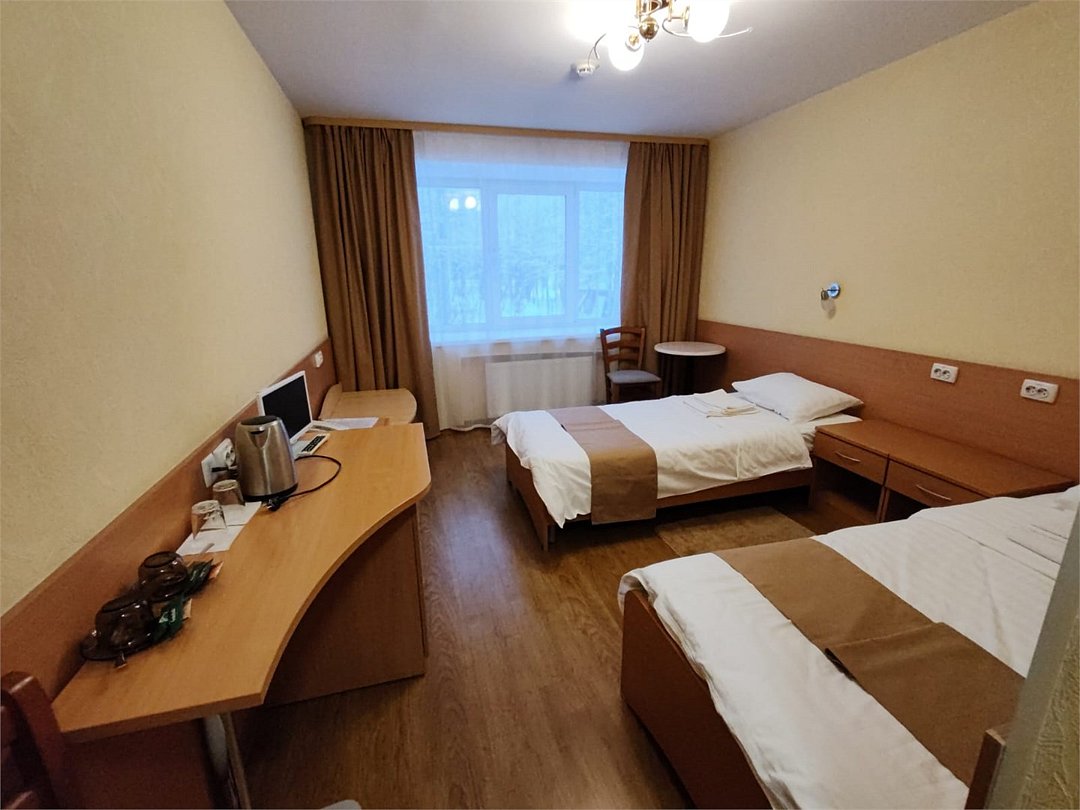 телевизор, Wi-Fi, холодильник, ванная комната, две односпальные кровати, тумбы, вешалки, письменный стол, зеркало, стул, стол, внутренний телефон, шкаф-купеВ гостиничном номере