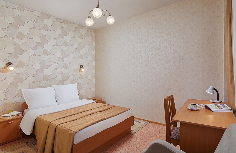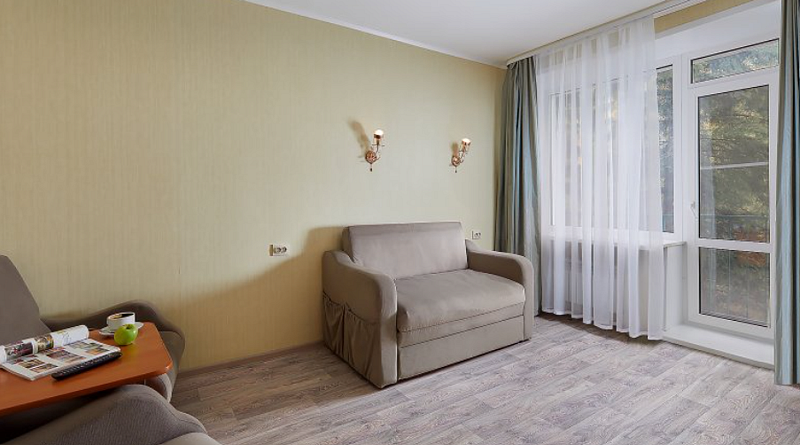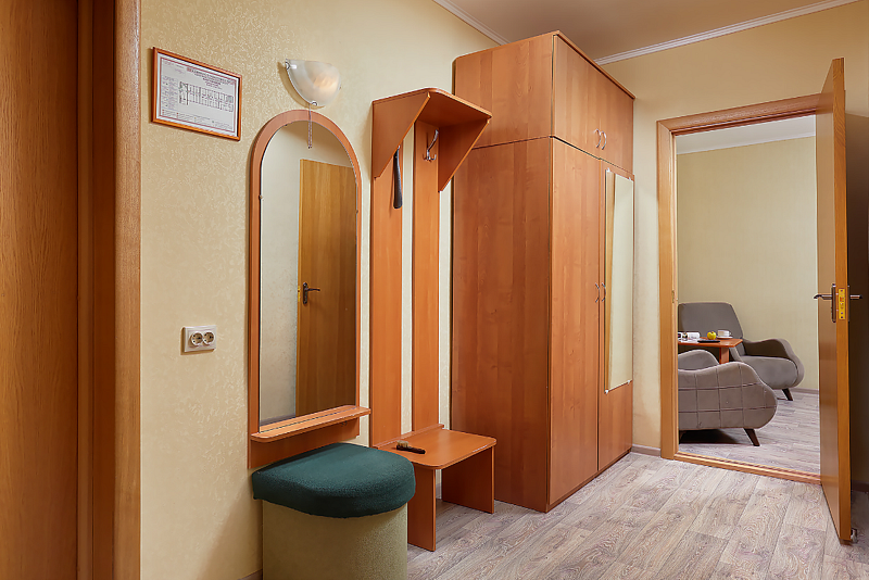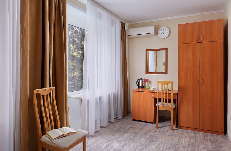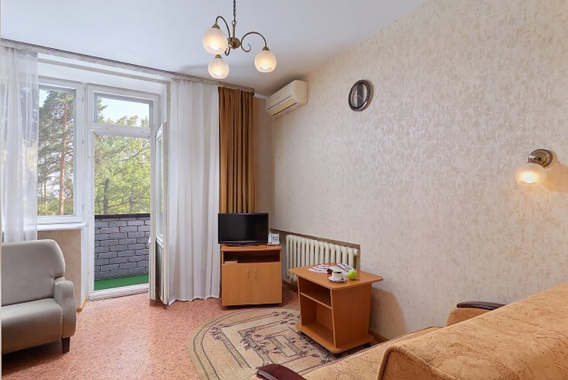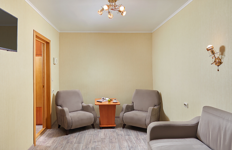 Двухместные двухкомнатные номера (34 кв.м, прихожая, зал) расположены на втором и третьем этаже главного корпуса. Окна номера выходят на территорию. В гостиной есть шкаф с комплектом столовой и чайной посуды. Номера с балконом.