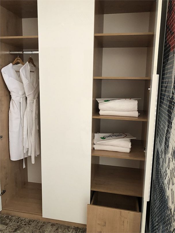 телевизор, Wi-Fi, телефон, холодильник, кондиционер, фен, душевая кабина, санузел, халаты, тапочки, гигиенические средства, балкон с красивым видом, две односпальные или большая двуспальная кровать, стулья, шкаф для одежды, вешалки, сейф, чайникВ месте в номере