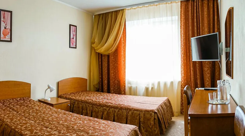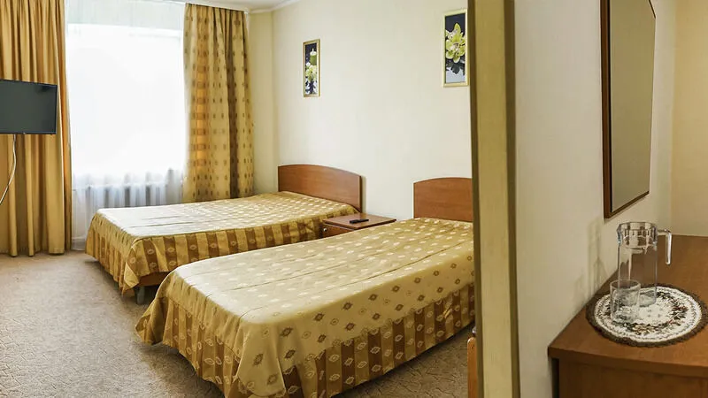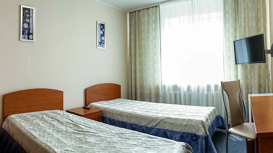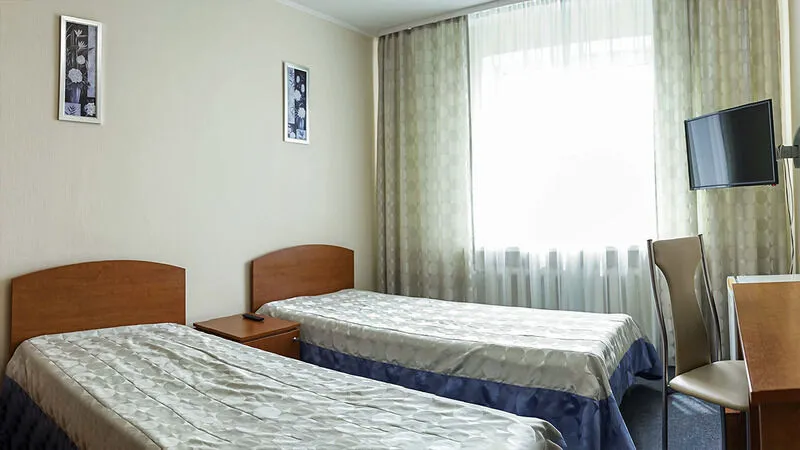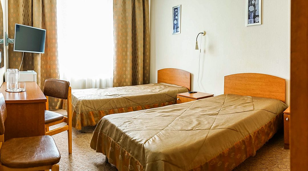 В номере две односпальные кровати с прикроватными тумбочками, шкаф для одежды, телевизор, холодильник, электрочайник, фен, бесплатный Wi-Fi.