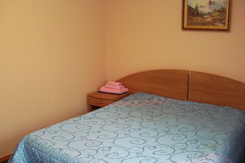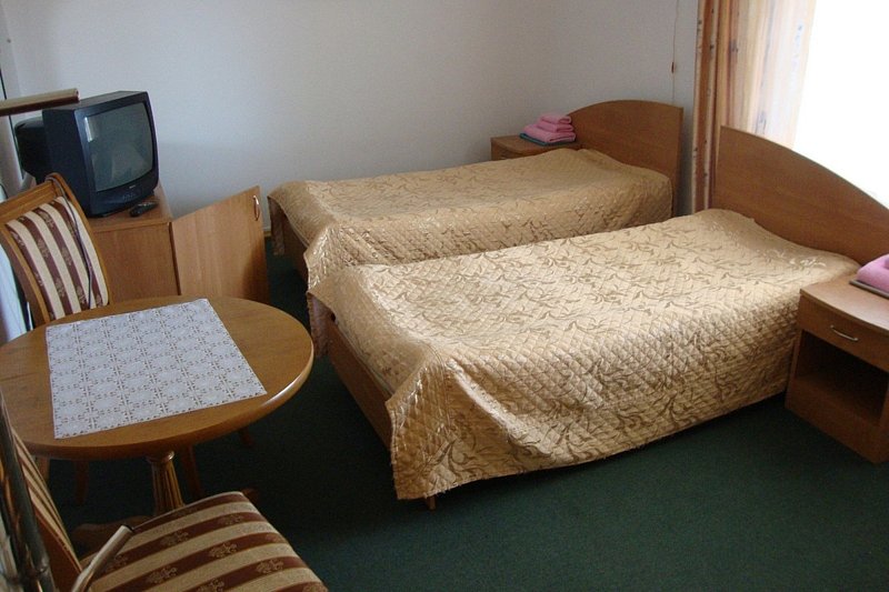 Небольшой, но очень уютный номер в корпусе № 2. Двуспальная кровать, раскладывается диван. С этажа есть выход на общую веранду, где в летнее время стоят столики со стульями, сушилки для белья, шезлонги.