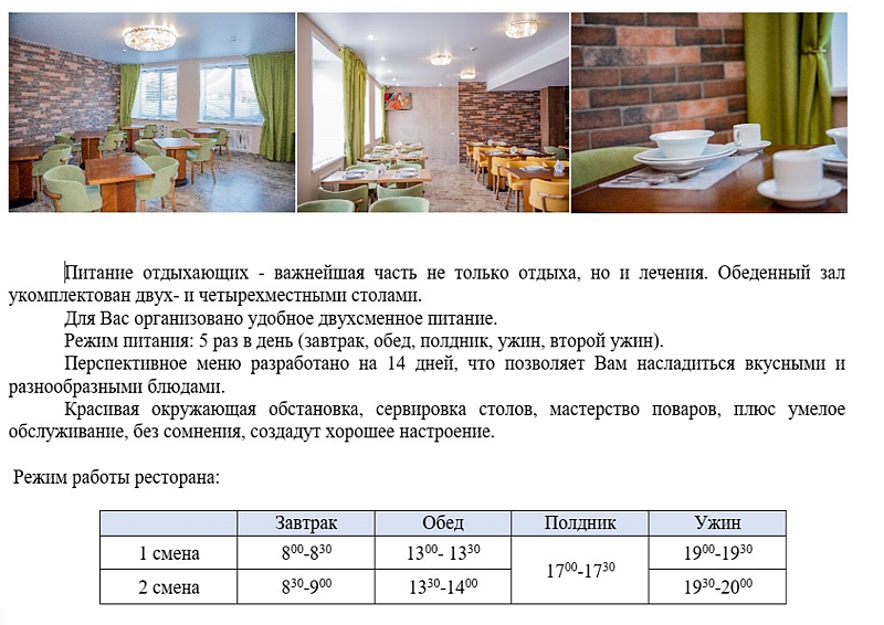 Помимо широкого спектра оздоровительных и лечебных услуг, профилакторий предлагает посетить ресторан с вкусной кухней, где также возможно проведение мероприятий, праздников, конференций и свадебных торжеств.