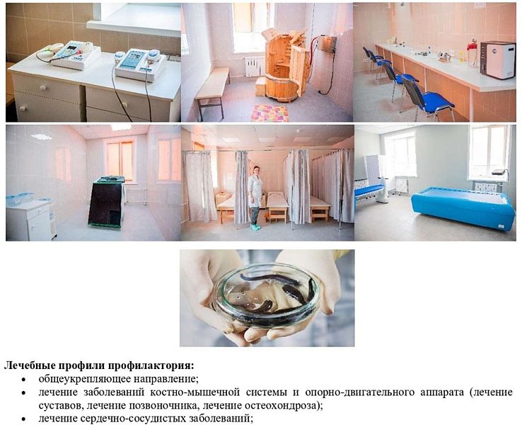 Основные профили лечения: общеукрепляющее направление, лечение костно-мышечной системы и опорно-двигательного аппарата и лечение сердечно-сосудистых заболеваний. Опытные специалисты помогут подобрать Вам подходящую программу и проконтролируют оздоровительные процессы.