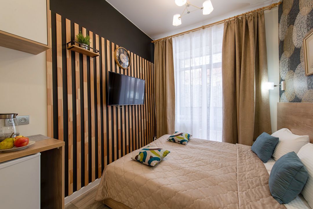 В данном номере имеется одна двуспальная кровать, базовые удобства (санузел, холодильник, ТВ, кондиционер, фен, чайник, посуда, халат, тапочки, средства гигиены).