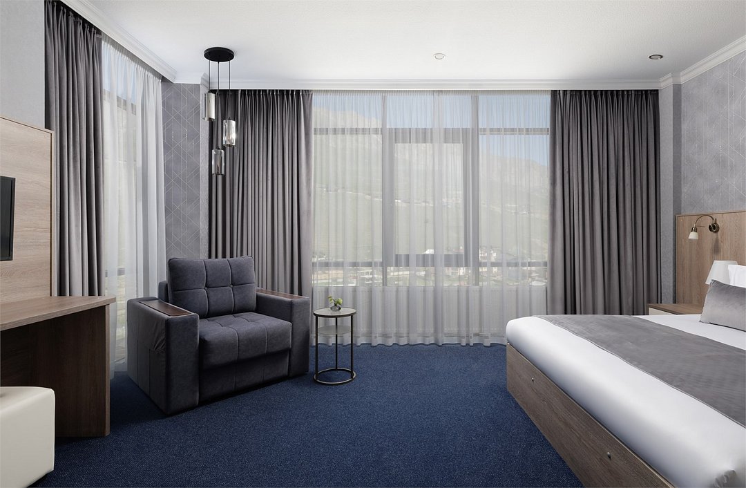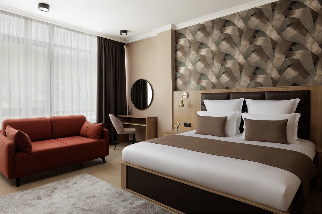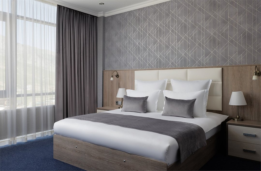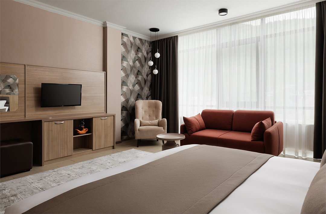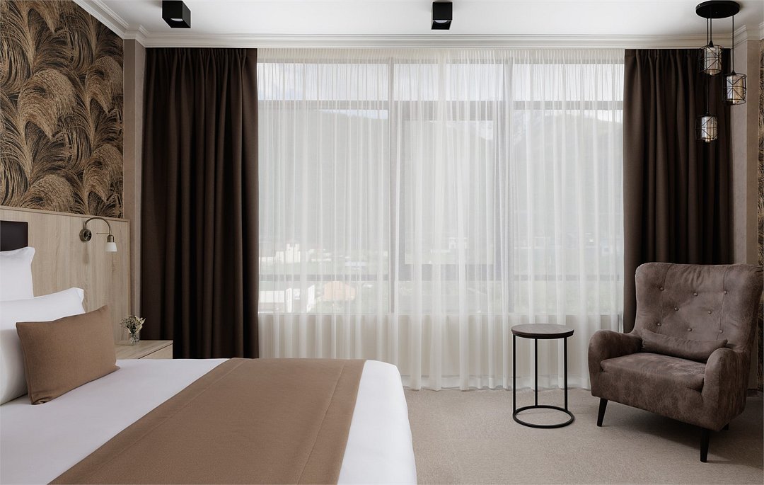 Шестиэтажное современное здание отеля, оснащенное лифтом, разместилось среди горных массивов Большого Кавказского Хребта. Жилой фонд включает в себя 93 номера категории Стандарт и Люкс. В номерах лаконичный стильный интерьер, современная бытовая техника, панорамные окна, санузел с душем и косметических принадлежностей для гостей.