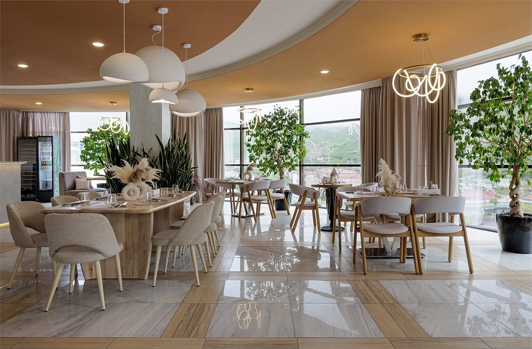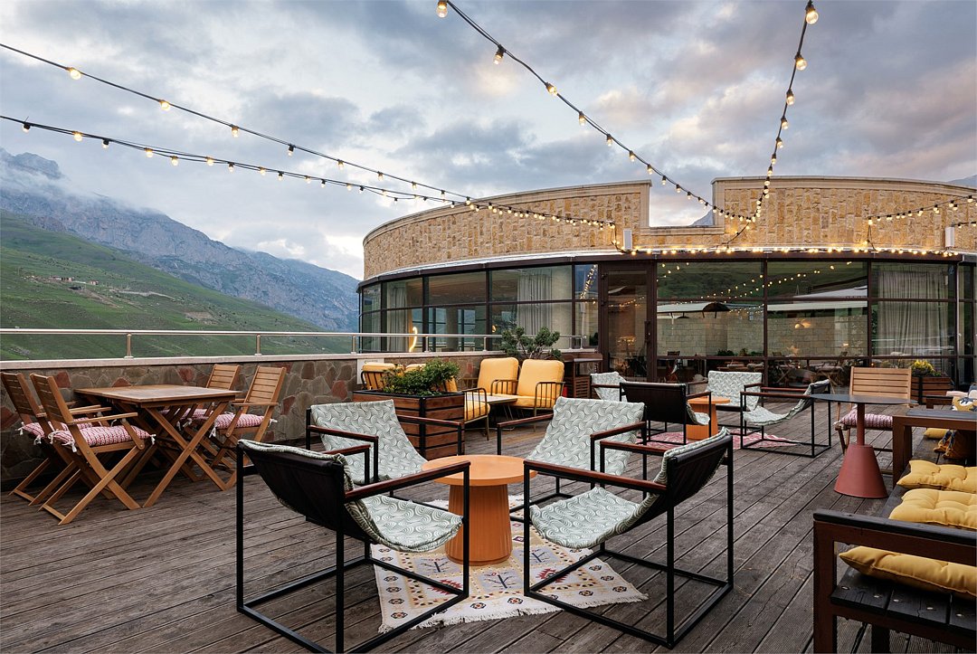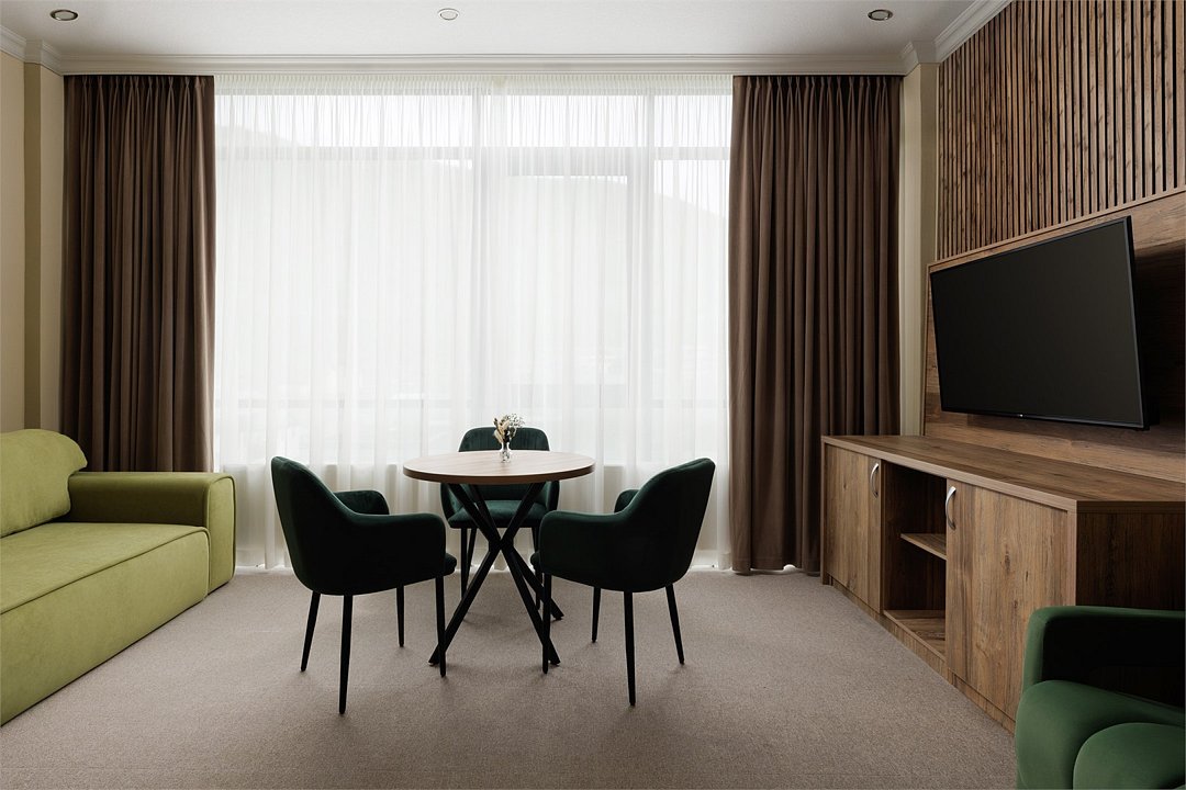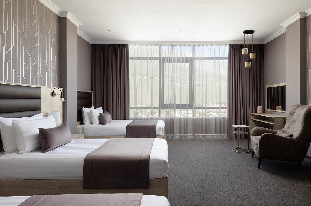 Шестиэтажное современное здание отеля, оснащенное лифтом, разместилось среди горных массивов Большого Кавказского Хребта. Жилой фонд включает в себя 93 номера категории Стандарт и Люкс. В номерах лаконичный стильный интерьер, современная бытовая техника, панорамные окна, санузел с душем и косметических принадлежностей для гостей.