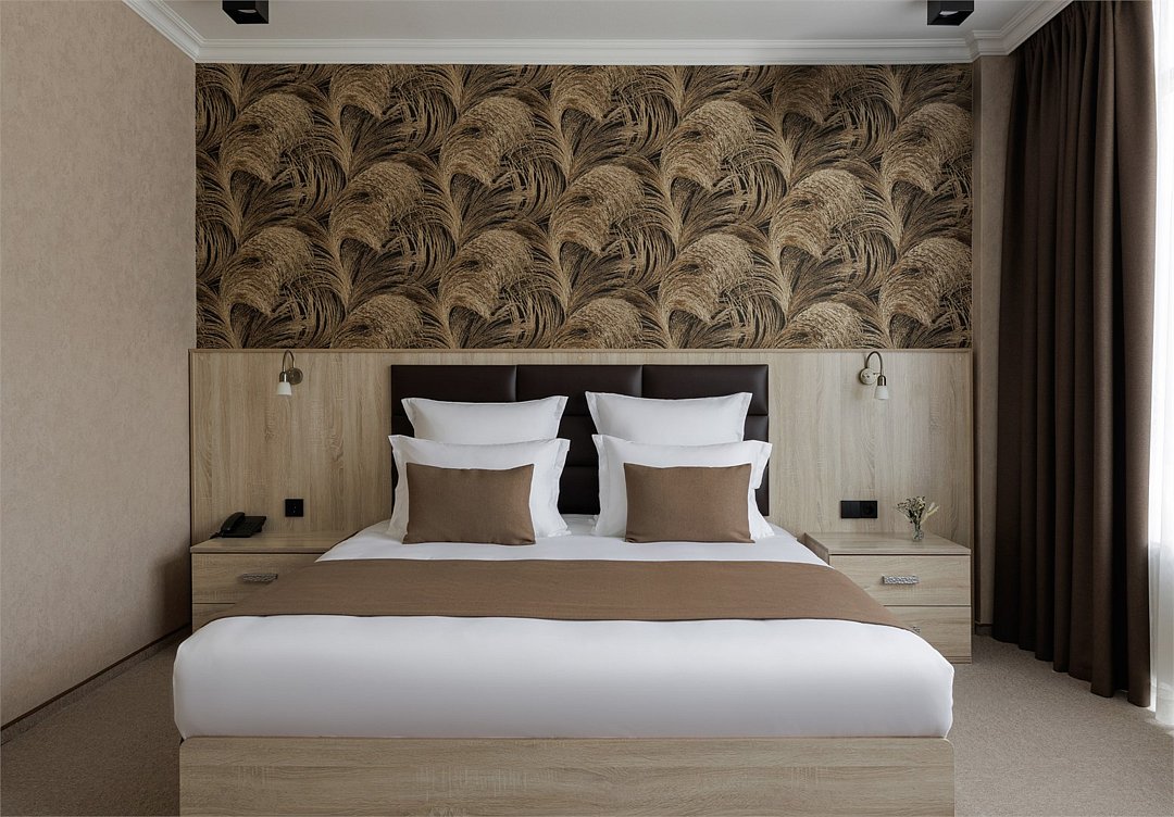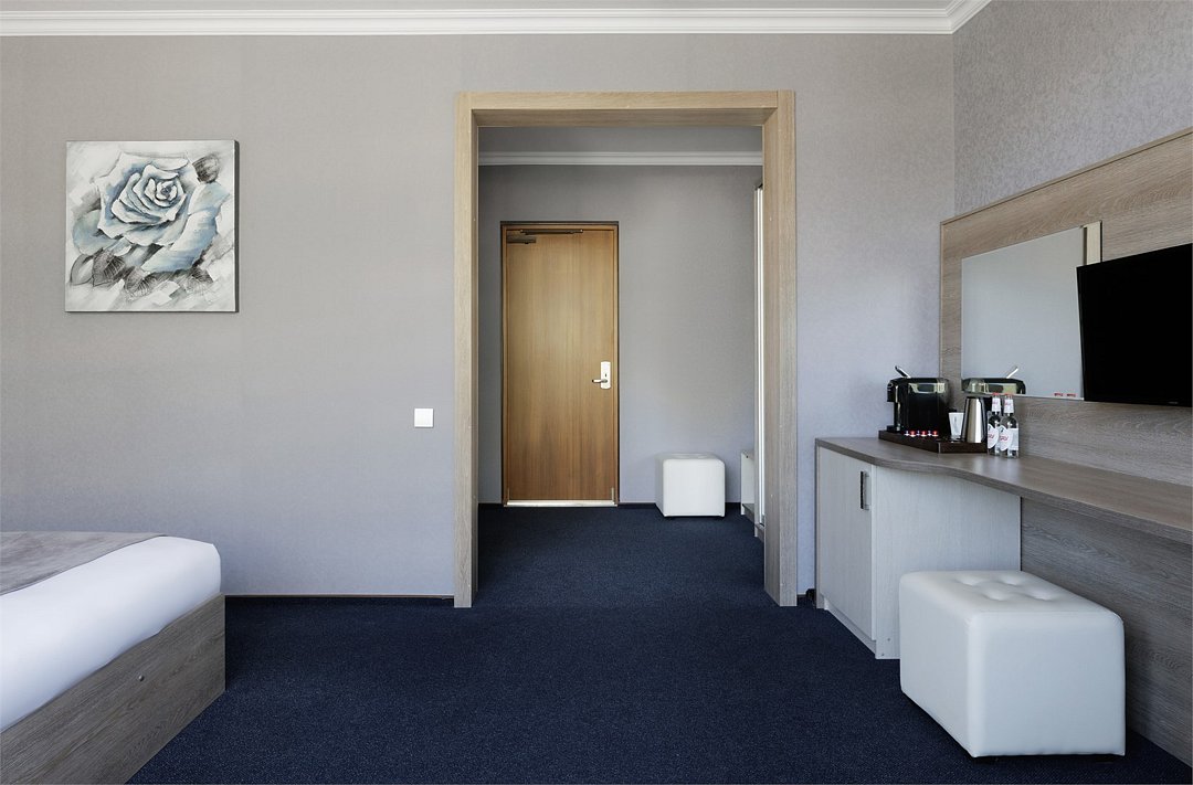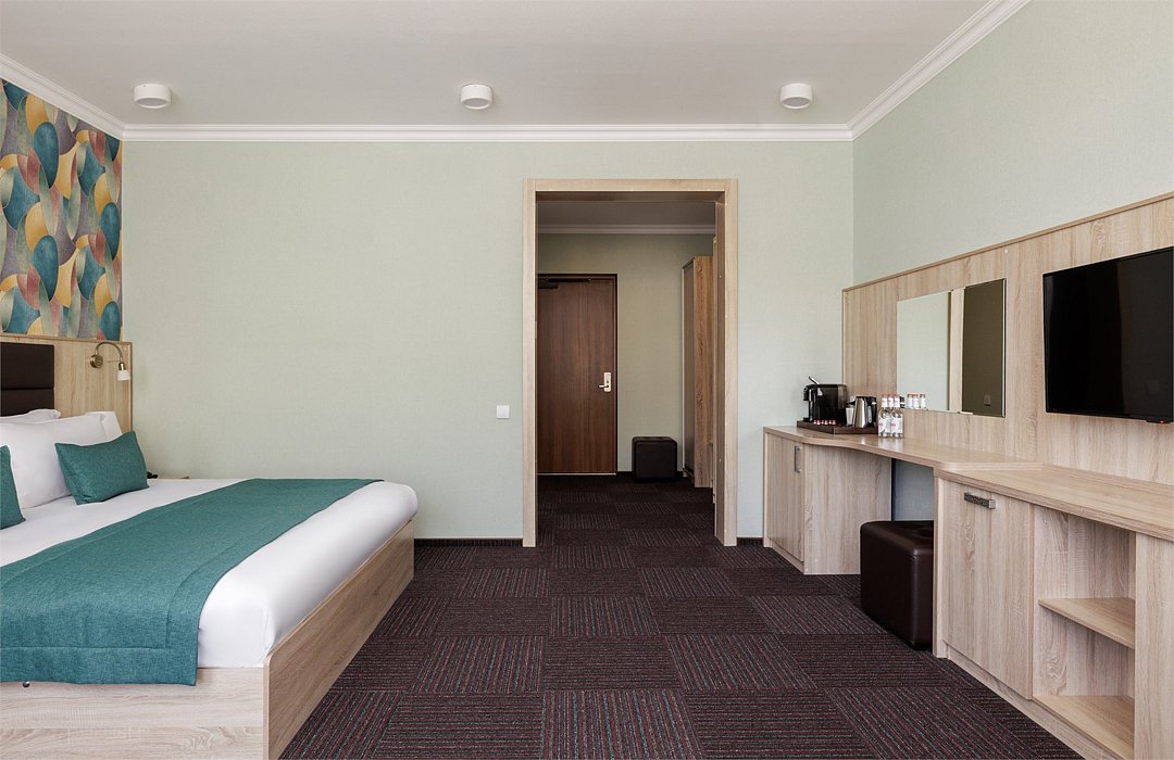 Просторный однокомнатный номер, в котором удачно сочетаются атмосфера комфорта и современный дизайн . В номере созданы все условия для приятного отдыха – это мягкая двуспальная кровать, журнальный стол, шкаф-купе, чайный набор. В номере имеется возможность размещения на дополнительном месте. Разумеется, предусмотрен кондиционер, холодильник, ЖК телевизор. Индивидуальный санузел оборудован душем или ванной. В стоимость номера входит бесплатный Wi-Fi и весь широкий спектр бесплатных услуг отеля, включая бассейн, тренажерный зал, сауну.Услуги и удобства