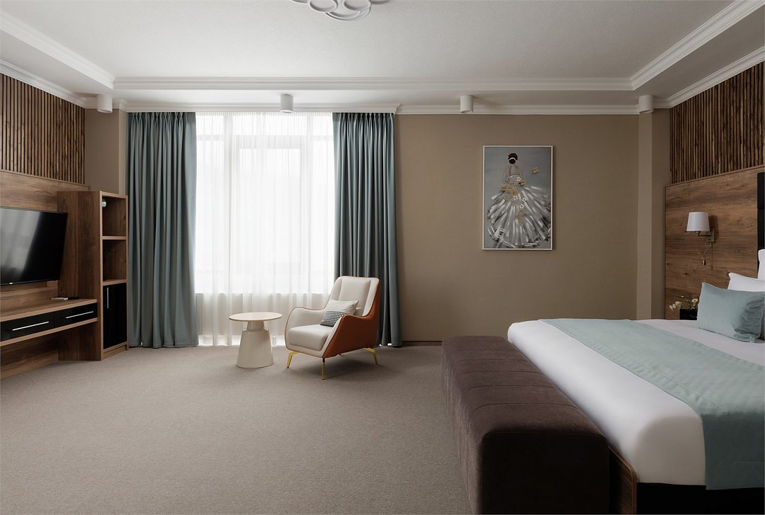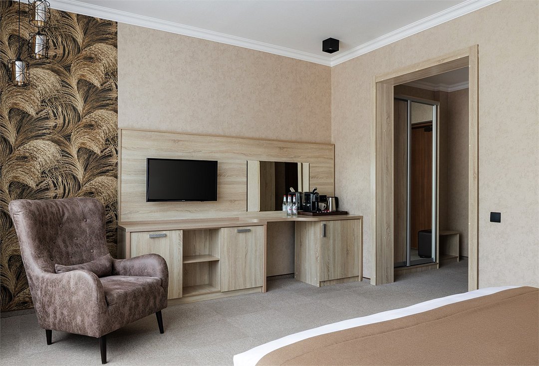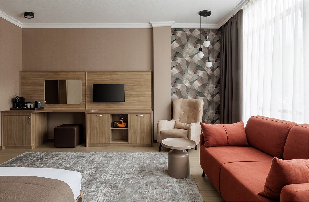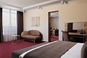 Просторный комфортабельный номер, в котором удачно сочетаются атмосфера комфорта и современный дизайн. В номере созданы все условия для приятного отдыха – это мягкая двуспальная кровать, раскладное кресло, журнальный стол, шкаф-купе, чайный набор. Разумеется, предусмотрен кондиционер, холодильник, ЖК телевизор. Индивидуальный санузел оборудован душем или ванной. В стоимость номера входит бесплатный Wi-Fi и весь широкий спектр бесплатных услуг отеля, включая бассейн, тренажерный зал, сауну.Услуги и удобства