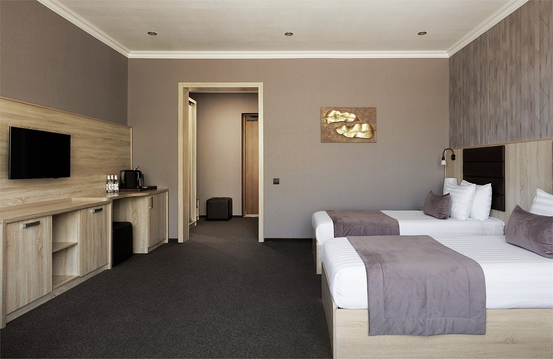 Уютный однокомнатный номер, в котором удачно сочетаются атмосфера комфорта и современный дизайн . В номере созданы все условия для приятного отдыха – это две отдельные удобные односпальные кровати, журнальный стол, шкаф-купе, чайный набор. Разумеется, предусмотрен кондиционер, холодильник, ЖК телевизор. Индивидуальный санузел оборудован душем или ванной. В стоимость номера входит бесплатный Wi-Fi и весь широкий спектр бесплатных услуг отеля, включая бассейн, тренажерный зал, сауну.Услуги и удобства