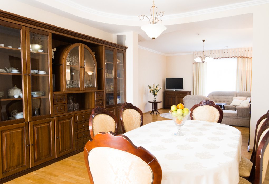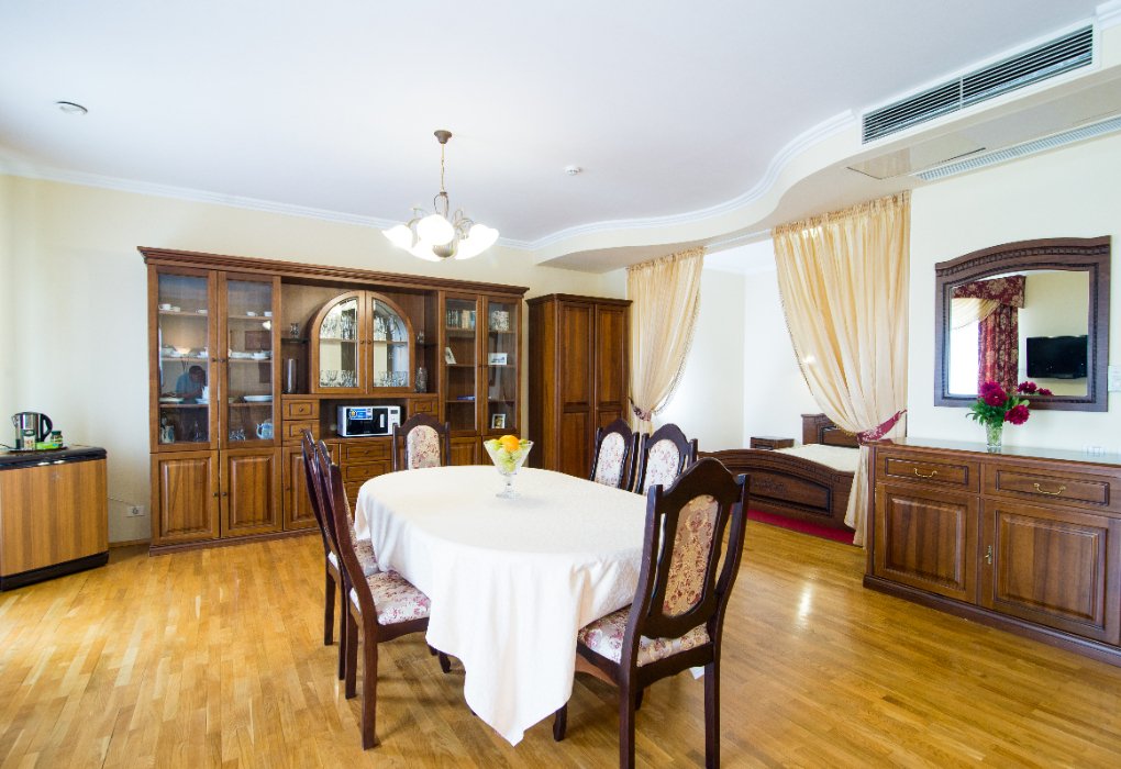Большой комфортабельный номер с двуспальной кроватью и диваном, оформленный в элегантной светло-бежевой гамме, идеален для размещения 1-4 человек. Номер, состоящий из спальни, гостиной, столовой и двух собственных ванных комнат, оснащён всем необходимым для комфортного отдыха