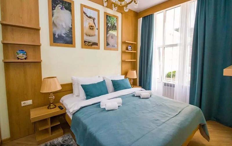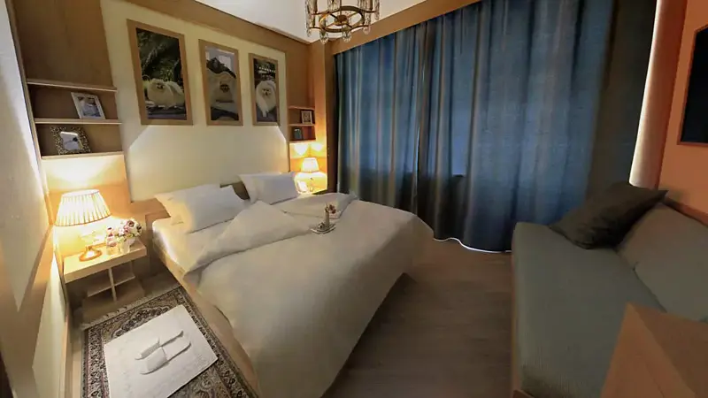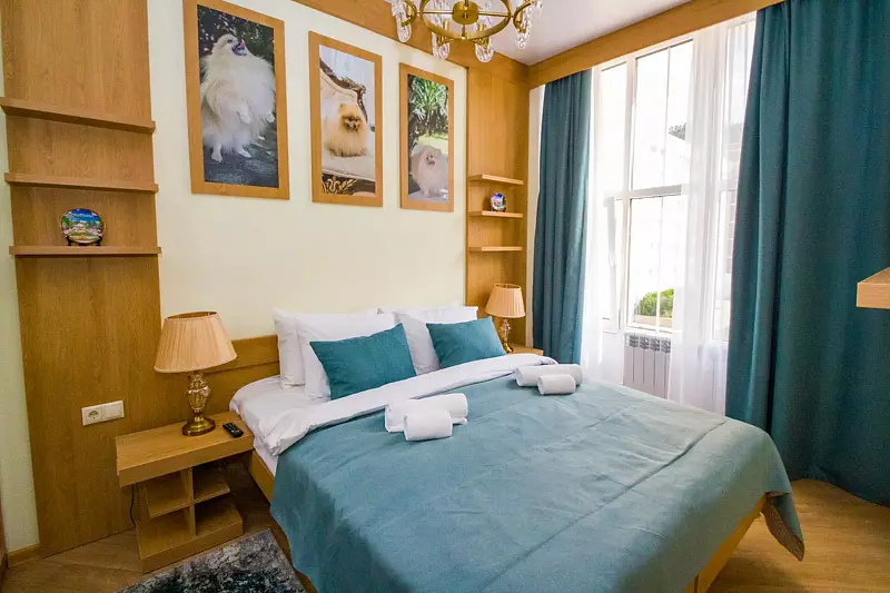 Состоит из просторной комнаты и современного санузла. Каждый номер разделен на несколько зон: рабочую, спальную и место для отдыха.