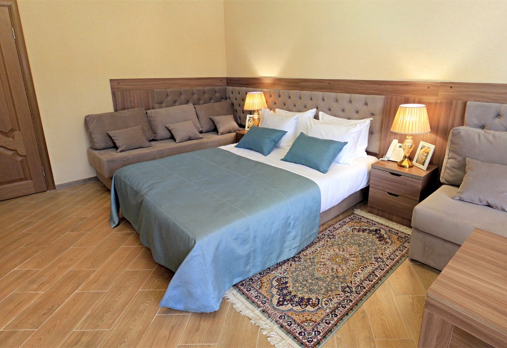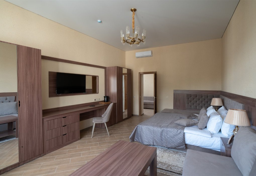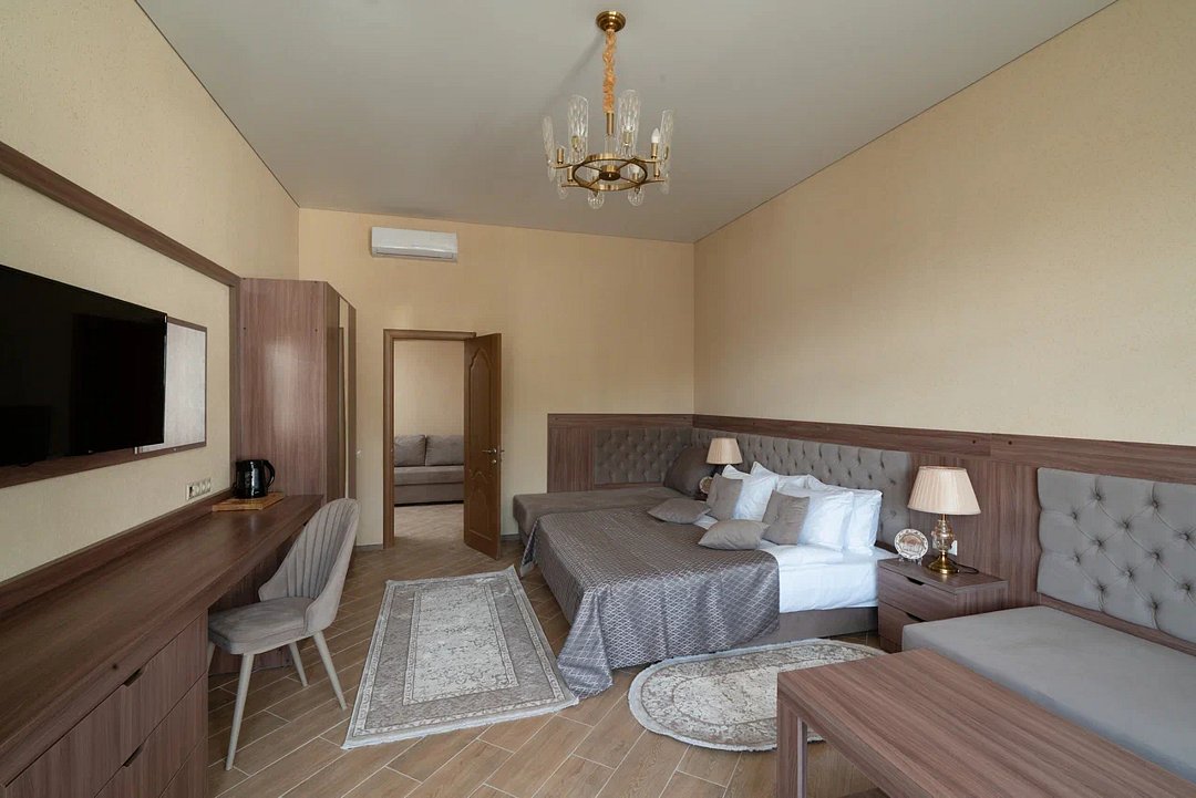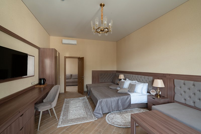 Номер оборудован комфортабельной спальней, которая обеспечит Вам крепкий, здоровый сон и приятный отдых, а также необходимой мягкой и корпусной мебелью в гостиной. Предусмотрено дополнительное место.