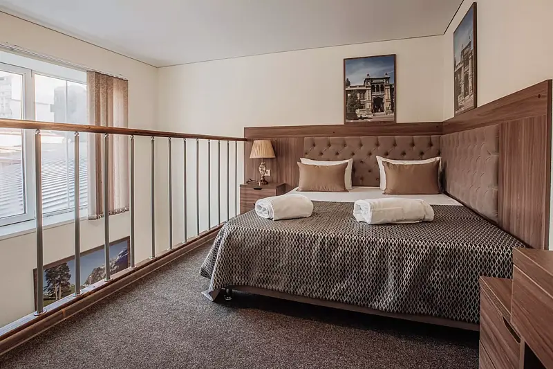 Состоит из просторной гостиной, спальни на втором уровне и современного санузла. Каждый номер разделен на несколько зон: рабочую, спальную и место для отдыха.
