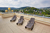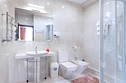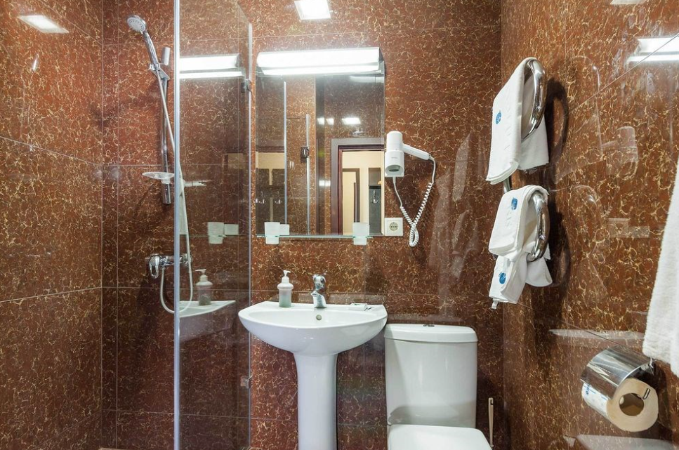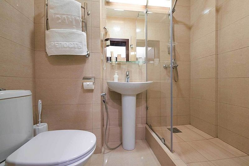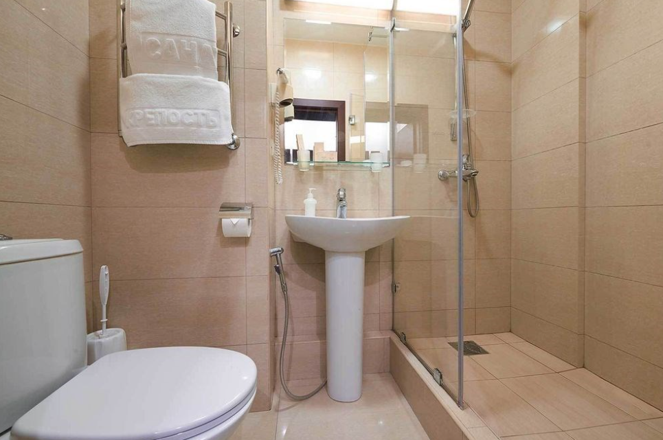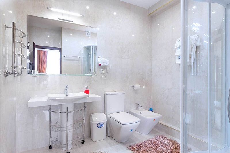 Тщательно продумана и меблировка: к услугам постояльцев – удобная 1,5-спальная кровать, изящные тумбы для хранения личных вещей, вместительный гардероб. Организована и небольшая зона отдыха, включающая оригинальный кофейный столик и мягкие кресла.