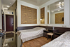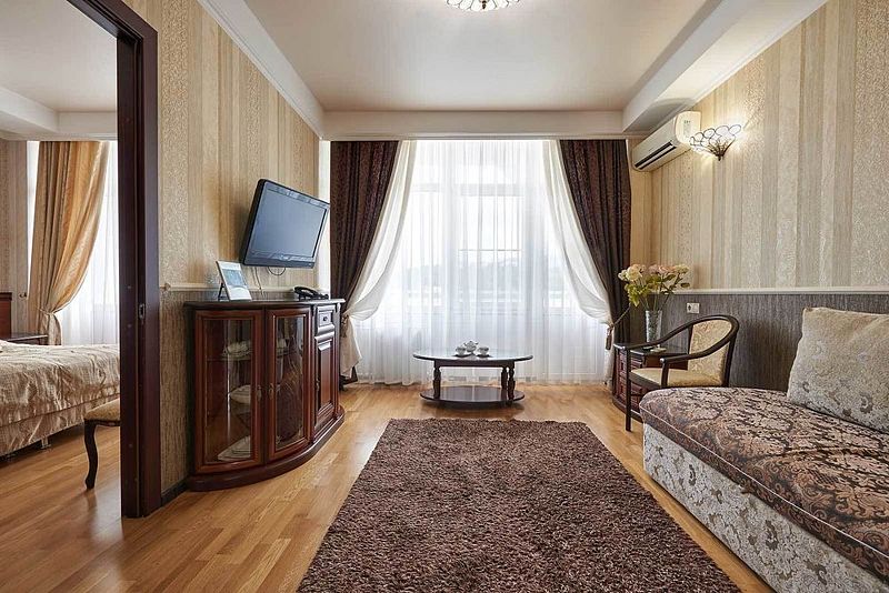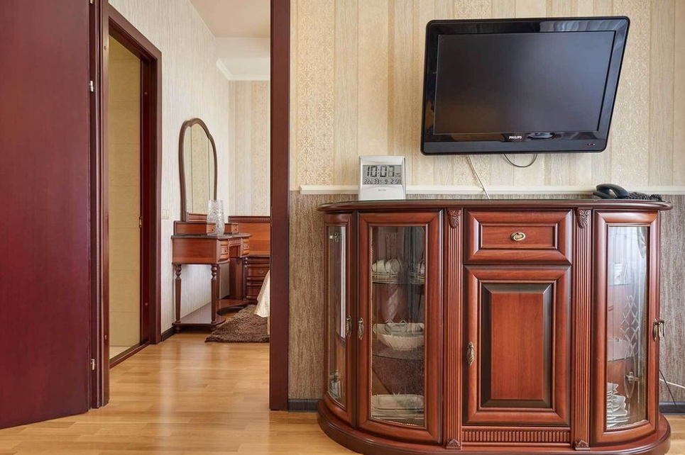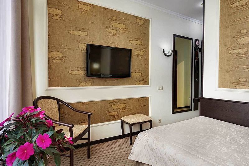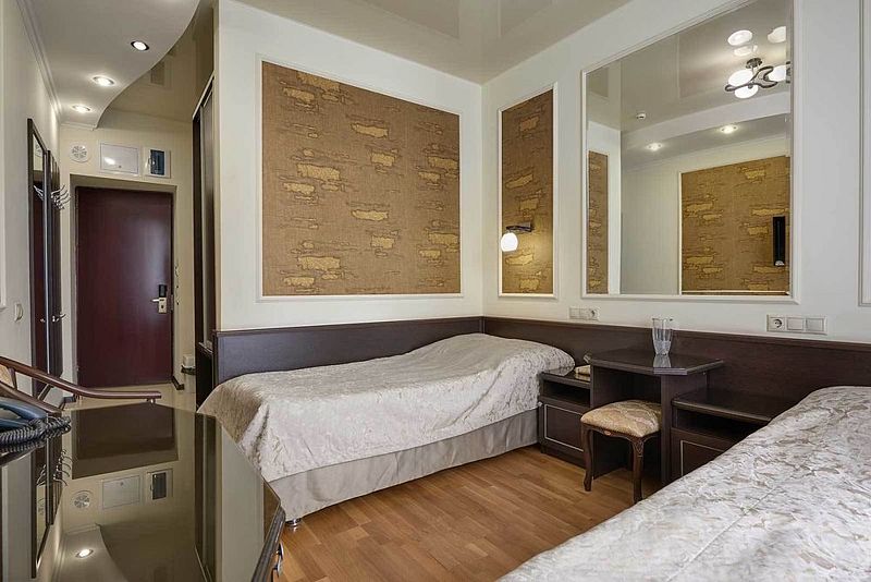 Данный номер оформлен в современном стиле. Золотисто-бежевый текстиль прекрасно оттеняет мебель шоколадного цвета, а миниатюрные бра придают пространству особенный уют. Небольшая прихожая встречает постояльцев огромным зеркалом, удобной вешалкой и вместительным гардеробом, который сохранит в идеальном состоянии все привезенные вами вещи. Также имеется комната с повышенной степенью безопасности.