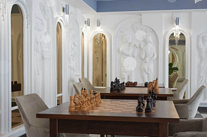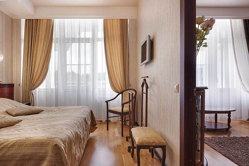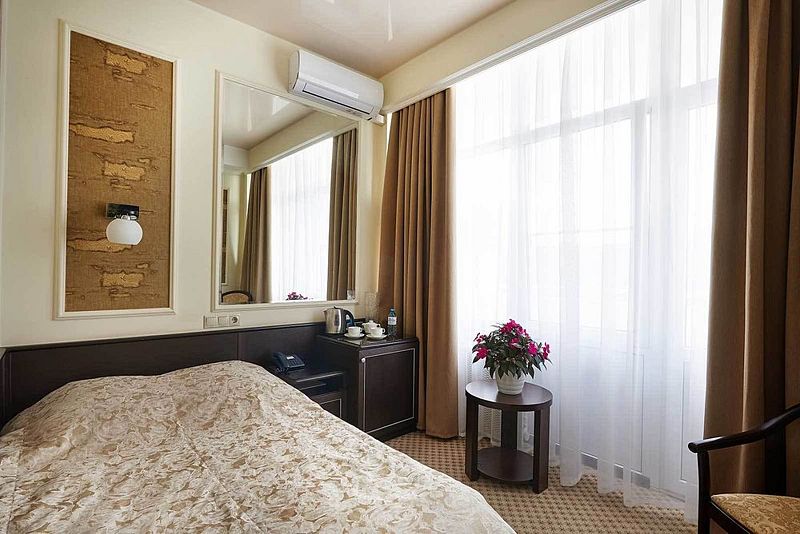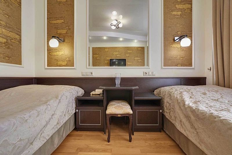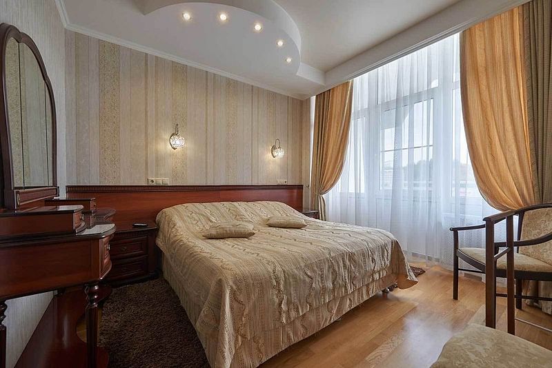 В роскошном «люксе» созданы максимально комфортные условия для проживания пары гостей. Оформление выполнено в лучших традициях королевских интерьеров: резная мебель; величественные ажурные светильники; элегантные тумбы цвета слоновой кости. В роли яркого акцента выступает текстиль золотистых и шоколадных оттенков. Пространство залито светом и манит атмосферой элегантного шика. Также имеется комната с повышенной степенью безопасности.