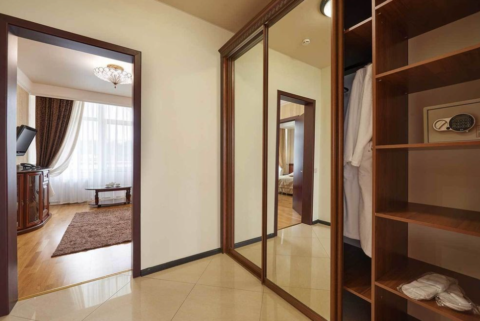 Данный номер оформлен в современном стиле. Золотисто-бежевый текстиль прекрасно оттеняет мебель шоколадного цвета, а миниатюрные бра придают пространству особенный уют. Небольшая прихожая встречает постояльцев огромным зеркалом, удобной вешалкой и вместительным гардеробом, который сохранит в идеальном состоянии все вещи. Также имеется комната с повышенной степенью безопасности.