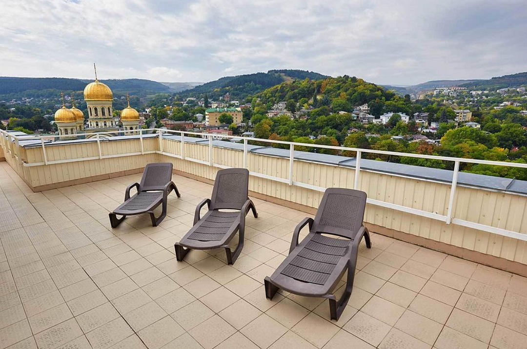 Это 13-этажное современное здание предлагает размещение в номерах различной категории комфортности. К услугам гостей 136 двухместных, 56 одноместных номеров и 16 люксов. Каждый номер оборудован телевизором, холодильником, телефоном и доступом к Wi-Fi. Предусмотрено полное трехразовое питание, включая диетические блюда. Комплекс процедур осуществляется в том же здании, с удобным теплым переходом из жилой зоны в лечебную. На территории санатория имеется охраняемая парковка.