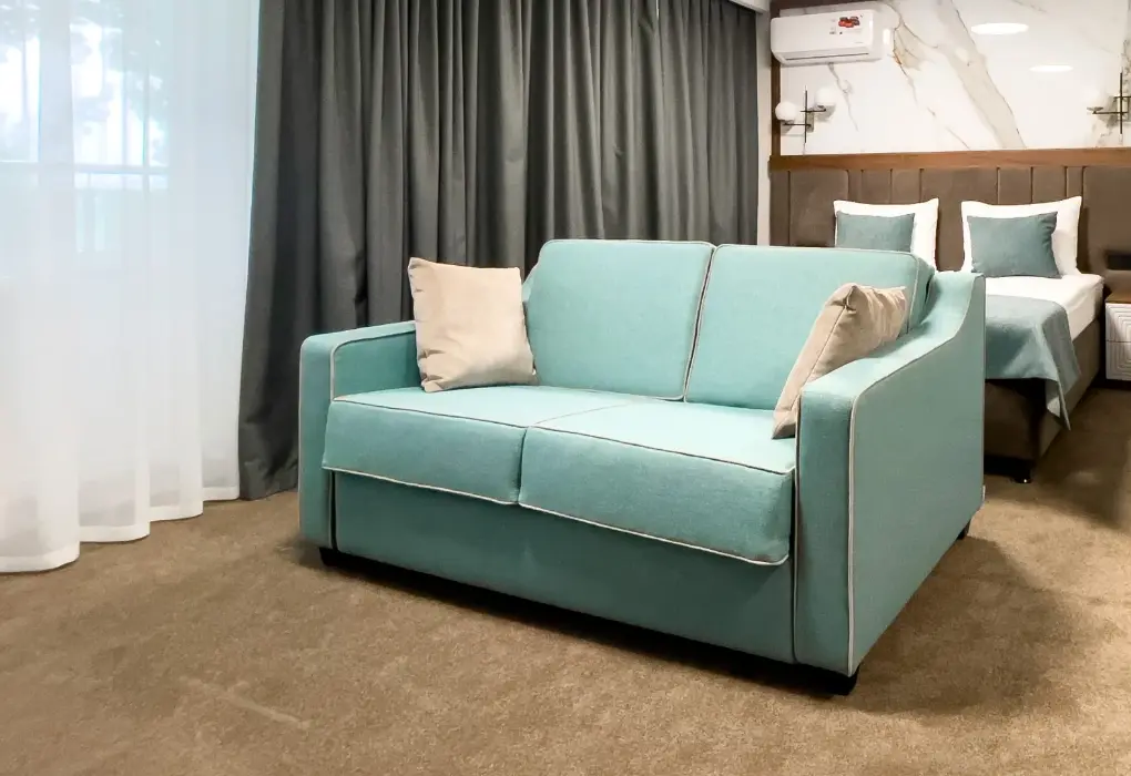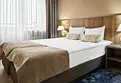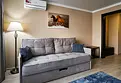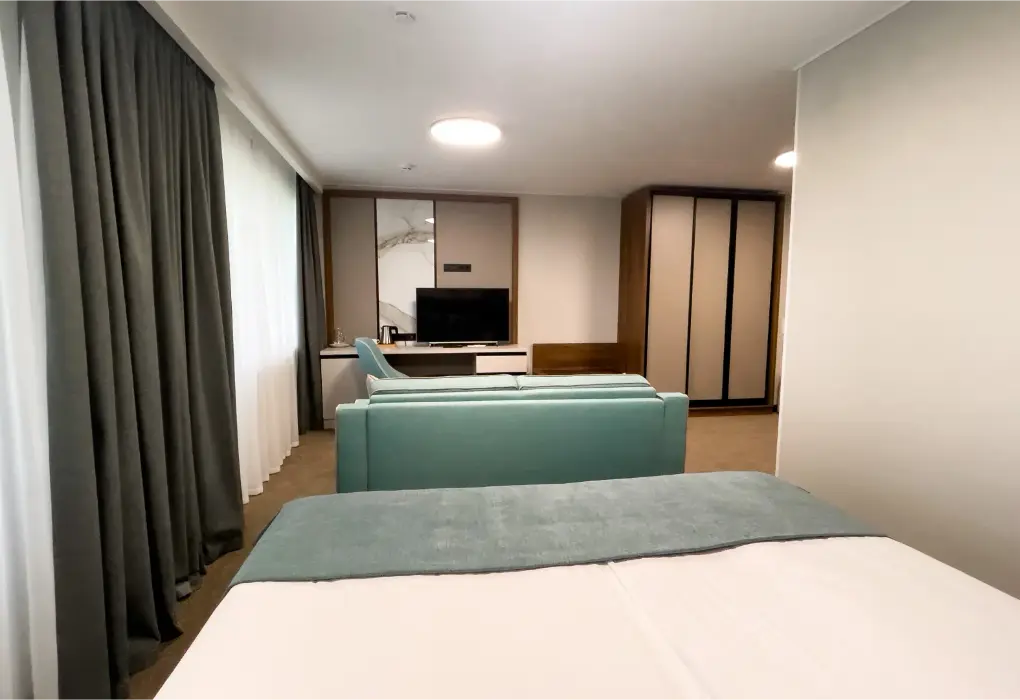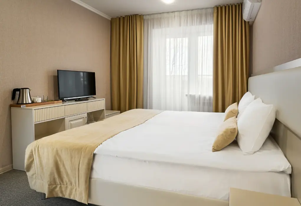 Комфортный, просторный номер делюкс клубный, с балконом. В номере двуспальная кровать, диванчик, телевизор, чайник, кофемашина, холодильник. Современные разнообразные светильники. Удобные матрасы средней жёсткости.